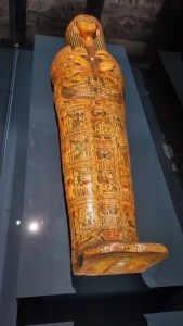 Dalla magnificenza regale si entra nell’universo del rito e del passaggio, dove la morte è intesa come trasformazione. Il monumentale sarcofago di Tuya, madre della regina Tiye, domina una sezione dedicata alle pratiche funerarie e alla fede di rinascita. Attorno, le statuette ushabti, i vasi canopi e un papiro del Libro dei Morti raccontano la precisione quasi scientifica con cui gli Egizi preparavano il viaggio nell’aldilà: un insieme di formule, immagini e strumenti per attraversare il mondo invisibile e rinascere alla luce di Ra.