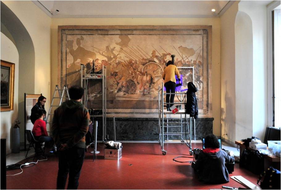 Attività di diagnostica sul mosaico di Alessandro al Mann (foto Pedicini Fotografi)
