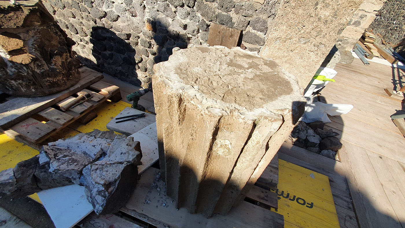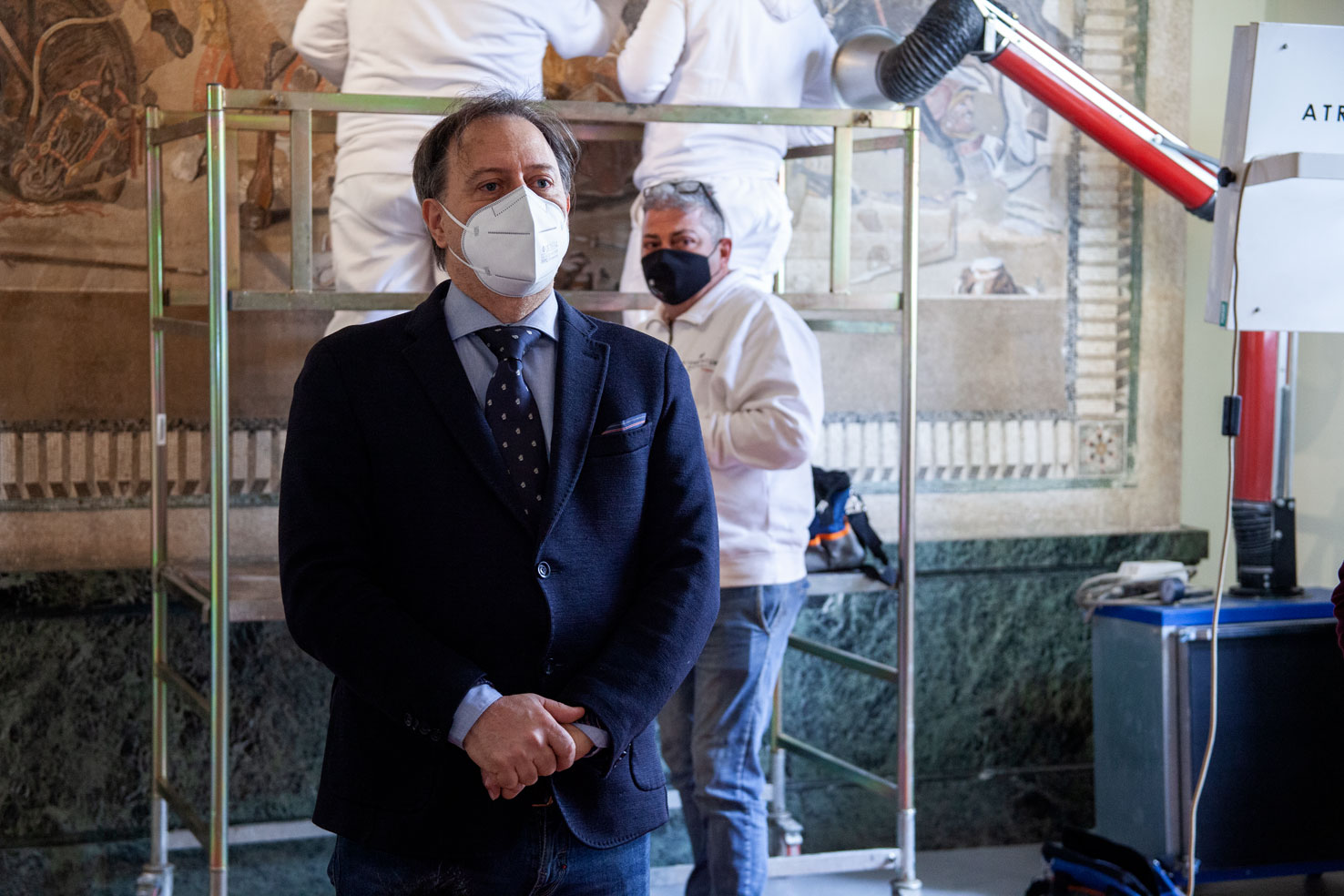PRIMA FASE (gennaio- febbraio 2021): l’intervento ipotizzato, da eseguirsi in situ mediante l’allestimento di un cantiere visibile, è finalizzato alla messa in sicurezza della superficie musiva prima della movimentazione dell’opera. In questa fase, il mosaico sarà oggetto di: accurata ispezione visiva e tattile di tutta la superficie, preliminare alla successive lavorazioni; pre-consolidamento delle tessere e degli strati di malta distaccati; pulitura; velinatura con idonei bendaggi di sostegno su tutta la superficie attualmente visibile. In un momento immediatamente successivo, previa apposizione di un tavolato ligneo di protezione, nonché di un’idonea intelaiatura metallica di sostegno, il mosaico sarà rimosso dall’attuale collocazione, mediante un sistema meccanico di movimentazione appositamente progettato. L’indagine diretta sarà accompagnata da ulteriori analisi strumentali, grazie alle quali si definiranno gli interventi di restauro ipotizzati nella prima fase della progettazione, stabilendo le azioni da eseguire sul supporto per garantire la conservazione del manufatto.