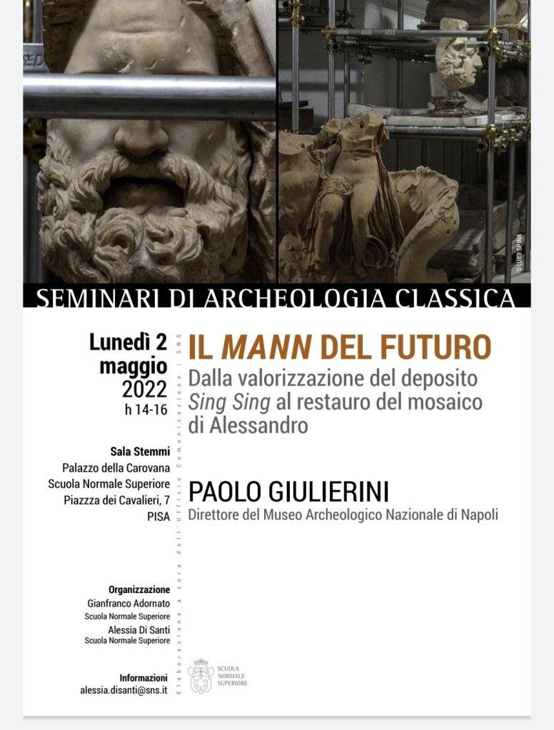 Il museo Archeologico nazionale di Napoli va in trasferta a Pisa. Sarà proprio il direttore Paolo Giulierini protagonista di una lectio nell’ambito dei “Seminari di archeologia classica” promossi dalla Scuola Normale Superiore di Pisa per l’organizzazione di Gianfranco Adornato e Alessia Di Santis. Appuntamento lunedì 2 maggio 2022, alle 14, nella sala degli Stemmi al Palazzo della Carovana, Scuola Normale Superiore, in piazza dei Cavalieri 7 a Pisa. Tema dell’incontro proprio “Il Mann del futuro”, dalla valorizzazione del deposito Sing Sing (vedi Napoli. Al museo Archeologico nazionale aperta la mostra fotografica “Sing Sing. Il corpo di Pompei” di Luigi Spina: che racconta i depositi del Mann, presto fruibili al pubblico con una nuova politica di accesso | archeologiavocidalpassato) al restauro del mosaico di Alessandro (vedi Napoli. Aperto il cantiere di restauro del Mosaico della Battaglia di Isso o Mosaico di Alessandro, simbolo del Mann, in partnership con università e Tim con soluzioni digitali in via sperimentale per nuove tecniche di restauro. Sarà visibile ai visitatori | archeologiavocidalpassato). I seminari si tengono in modalità blended, sulla piattaforma Teams. Per partecipare on-line o in presenza scrivere a: alessia.disanti@sns.it.