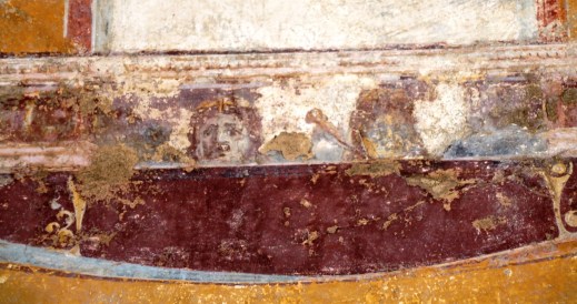 L’ambiente 11, eseguito con una partitura decorativa simile a quella dell’ambiente 7 , si ipotizza eseguito dalla stessa officina pittorica. L’intervento, iniziato quest’anno, ha visto innanzitutto il consolidamento delle pareti che rischiavano di sfaldarsi. Per evitarne il degrado si è proceduto ad un pre-consolidamento e poi alla pulitura, sia con impacchi che con l’ausilio di una strumentazione tecnica adeguata, che sta rivelando prime interessanti evidenze pittoriche.