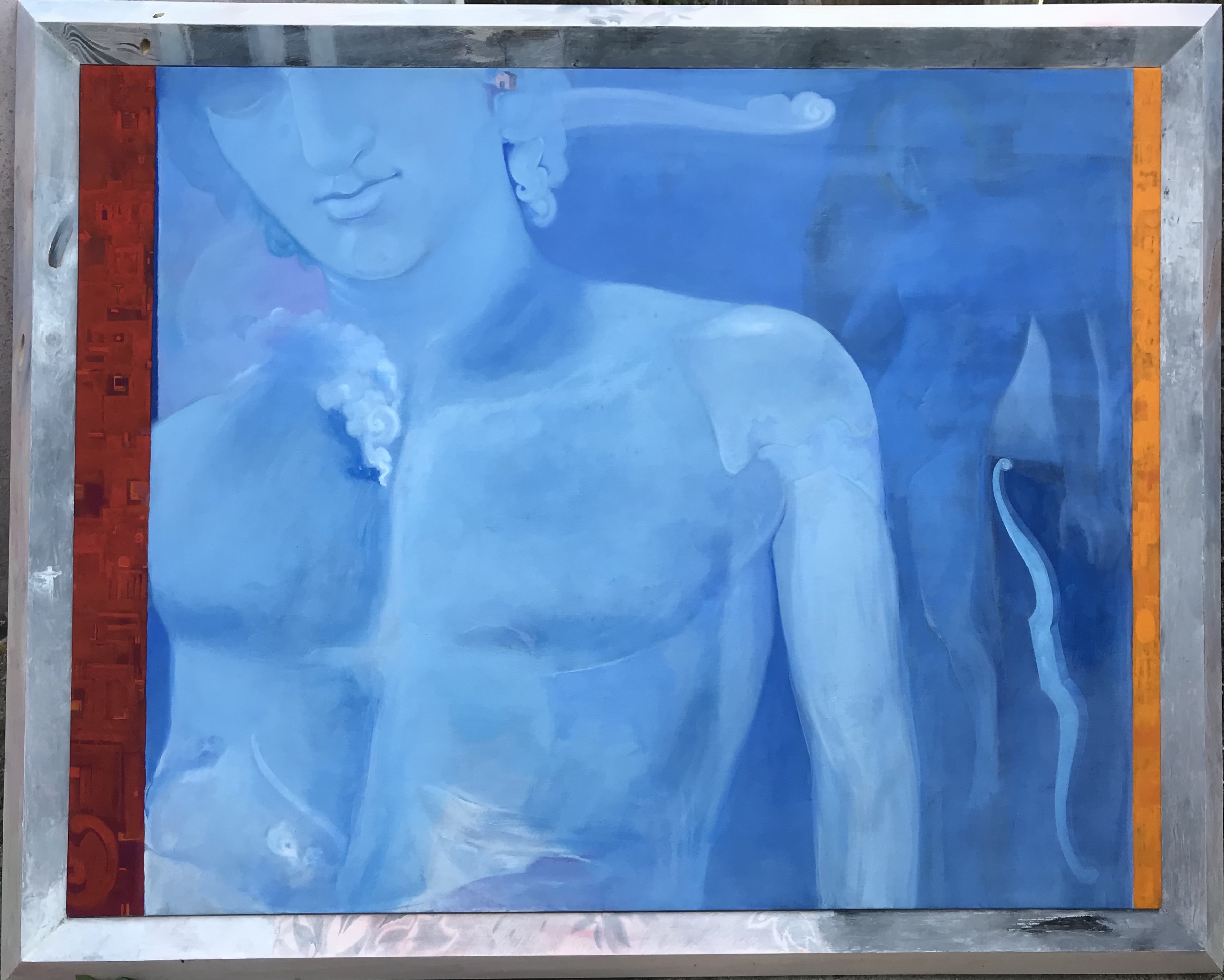 La mostra del Mann, patrocinata dalla Fondazione Banco di Napoli e sponsorizzata dalla Fondazione Plart, raccoglie dodici tele, accostate a un’installazione lignea intarsiata (non casuale il titolo: dodici facce) e a tre panche che riproducono le suggestioni tratte dalla figura scultorea. Adone diviene creatura surreale e, in un certo senso, legata alla dimensione urbana: nei quadri, in cui sono predominanti i colori da sogno dell’azzurro e del blu sfumato, il giovane è profilo protettivo che sorvola e osserva la città, in pose che riecheggiano la fantasia di Marc Chagall (tela “La distanza); è ponte fra passato e presente come suggerisce il suo busto tagliato in una raffigurazione; si trasforma in creatura antropomorfa come custode di una memoria antica.