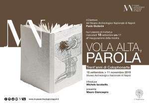 Chiusa la mostra “Assiri”, non certo la programmazione del Mann. Mercoledì 18 settembre 2019 (alle 17), il vernissage della mostra “Vola alta, parola. Trent’anni di Colophonarte”, dove sarà ripercorso il viaggio culturale della casa editrice bellunese, nota, in Italia ed all’estero, per i raffinati libri d’artista, realizzati con i contributi di importanti autori internazionali (solo per citarne alcuni: Mimmo Paladino, Enrico Castellani, Arnaldo Pomodoro, Lucio Del Pezzo, Giuseppe Maraniello, Kounellis, Enrico Baj, Emilio Isgrò, Giorgio Griffa, Roberto Barni, Giulio Paolini, Ferdinando Scianna, Hermann Nitsch, Corneille, Eduardo Arroyo, Claude Viallat, François Morellet, Medhat Shafik, Michel Kenna).