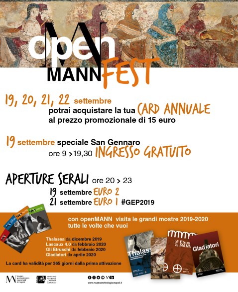 E dal 19 al 22 settembre 2019, al via l’OpenMANNFest: per quattro giorni, sarà possibile, esclusivamente presso la biglietteria del museo, sottoscrivere a prezzi promo l’abbonamento annuale all’Archeologico (15 euro per adulti, 10 per giovani tra i 18 ed i 25 anni, 30 per una coppia di over 25). L’OpenMANN Fest è stato programmato non soltanto in occasione della festività di San Gennaro (dalle 9 alle 19, l’ingresso al Mann sarà gratuito, mentre dalle 20 alle 23 il museo resterà aperto con ticket a 2 euro), ma anche delle Giornate Europee del Patrimonio. Il 21 ed il 22 settembre, saranno in calendario, infatti, alcuni eventi culturali per festeggiare gli European Heritage Days: sabato 21 (ore 18), presentazione del volume “Gli ultimi giorni del comandante Plinio” di Alessandro Luciano; per l’apertura serale (orario: 20-23; costo: 1 euro), nel Giardino delle Fontane (ore 21), in programma il concerto dei dipendenti dell’Archeologico intitolato “DivertissMANN”. Spazio per il pubblico di giovanissimi (8-12 anni), nel laboratorio didattico “Archaeology for kids”, previsto per domenica 22 settembre (ore 11): partendo dalla mostra “Mann on the moon”, la fantasia dei più piccoli sarà guidata in un suggestivo racconto delle stelle, realizzato in collaborazione con l’Osservatorio Astronomico di Capodimonte e la Biblioteca Nazionale di Napoli (l’evento, condotto dalla prof. Alessandra Pagliano, rientra nella preview della manifestazione “La notte dei ricercatori 2019). E durante le aperture serali (19 e 21 settembre) sarà possibile degustare gli aperitivi preparati dal MANNCaffé (le consumazioni non saranno incluse nel ticket di ingresso al MANN).