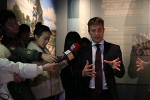 Il direttore Zuchtriegel con le autorità cinesi nella sala con la ricostruzione della Tomba del Tuffatore (foto parco archeologico Paestum)