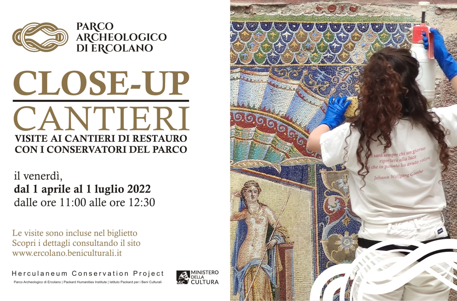 A grande richiesta dei visitatori e per proseguire nel progetto di sensibilizzazione dei visitatori del parco archeologico di Ercolano, torna dunque l’appuntamento “Close up cantieri”. Partito nel 2018 e divenuto un evento attesissimo, l’iniziativa coinvolge i turisti nel quotidiano lavoro di conservazione svolto dallo staff del Parco, in una fruizione sempre più consapevole. I visitatori interessati a partecipare alla visita immersiva nei cantieri del Parco verranno condotti presso i siti accessibili coinvolti nel progetto dove incontreranno i restauratori responsabili del cantiere, con possibilità di guida in lingua inglese. Il primo “Close up” partirà venerdì 1° aprile 2022, per un totale di 15 appuntamenti che si ripeteranno ogni venerdì mattina, fino all’8 luglio 2022. I turni di visita saranno tre, a partire dalle 11. “Close up cantieri è diventato ormai un format del Parco di Ercolano”, dichiara il direttore Francesco Sirano, “il venerdì mattina i visitatori, attraverso il programma di inclusione e di partecipazione alle attività di restauro e manutenzione del patrimonio archeologico dell’antica città, saranno condotti all’interno delle domus, potendo avvicinare e toccare con mano il lavoro che si svolge dietro le quinte dei cantieri di restauro. L’intento è arrivare ad una fruizione sempre più consapevole e partecipata”.