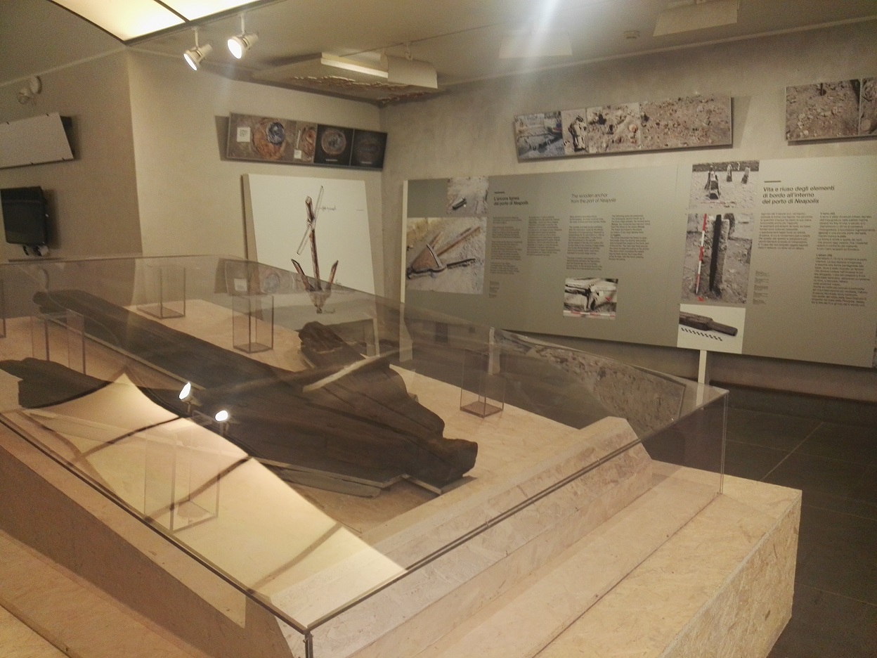 L’accesso alla “Stazione Neapolis” passa quasi inosservato alle centinaia di visitatori che ogni giorno varcano l’ingresso del museo Archeologico nazionale di Napoli: letteralmente rapiti nel grande atrio dalle meraviglie annunciate dai poster-arazzi che descrivono le diverse sezioni e le collezioni, la piccola locandina all’imbocco della scala che porta alla Sezione Epigrafica rimane muta resta ai margini del flusso. Eppure la scala che scende nelle “viscere” del Mann porta a rivivere forse la più importante scoperta archeologica recente a Napoli: il porto antico. Nella sala “Stazione Neapolis” del Mann sono esposti reperti che ricostruiscono storia e caratteristiche del porto antico di Napoli, partendo dalla prima fase di scavi della metropolitana di piazza Municipio, agli inizi degli anni Duemila, e giungendo sino agli ultimi ritrovamenti, tra 2014 e 2015. Per gentile concessione della soprintendenza Archeologia, Belle Arti e Paesaggio per il Comune di Napoli, sono visibili al Mann, per la prima volta proprio in occasione della mostra “Thalassa. Meraviglie sommerse del Mediterraneo” (vedi https://archeologiavocidalpassato.com/2019/12/30/al-museo-archeologico-nazionale-di-napoli-la-mostra-thalassa-meraviglie-sommerse-dal-mediterraneo-vetrina-delle-scoperte-dellarcheologia-subacquea-dal-1950-ad-oggi-viaggi/), tre importanti e singolari reperti lignei: una splendida ancora di oltre due metri e mezzo (databile alla fine del II sec. a.C.), un remo e un albero (età imperiale), residui delle imbarcazioni che attraccavano nell’antico porto cittadino. Opere che è stato possibile presentate al pubblico grazie a un intervento conservativo realizzato dall’Istituto Superiore per la Conservazione ed il Restauro.