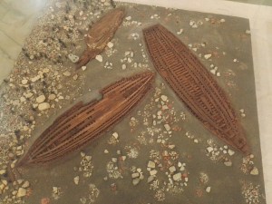 Scese le scale si è accolti da una barca, modello ligneo che propone in scala 1:5 la ricostruzione di una imbarcazione particolare: la Napoli C (fine I sec. d.C.), i cui resti furono messi in luce nel 2004 in piazza Municipio durante lo scavo dei fondali del porto romano. Si tratta di un’imbarcazione da trasporto e da carico (una horeia), in origine di 14 metri, con la prua a specchio che permetteva un attracco perpendicolare alle banchine portuali e ai fianchi delle navi alla fonda. L’horeia Napoli C doveva navigare nel golfo di Napoli ed essere utilizzata nel bacino portuale. Le più antiche fasi del porto di Napoli risalgono alla nascita di Parthenope nella seconda metà dell’VIII sec. a.C. in rapporto all’espansione di Cuma, la più antica colonia greca d’Occidente, e alla fondazione di Neapolis tra il VI e il V sec. a.C.: entrambi i centri dominavano l’accesso meridionale delle bocche di Capri e quello settentrionale del canale di Procida e ciò permetteva il controllo di un passaggio obbligato della rotta tra il basso e l’alto Tirreno.