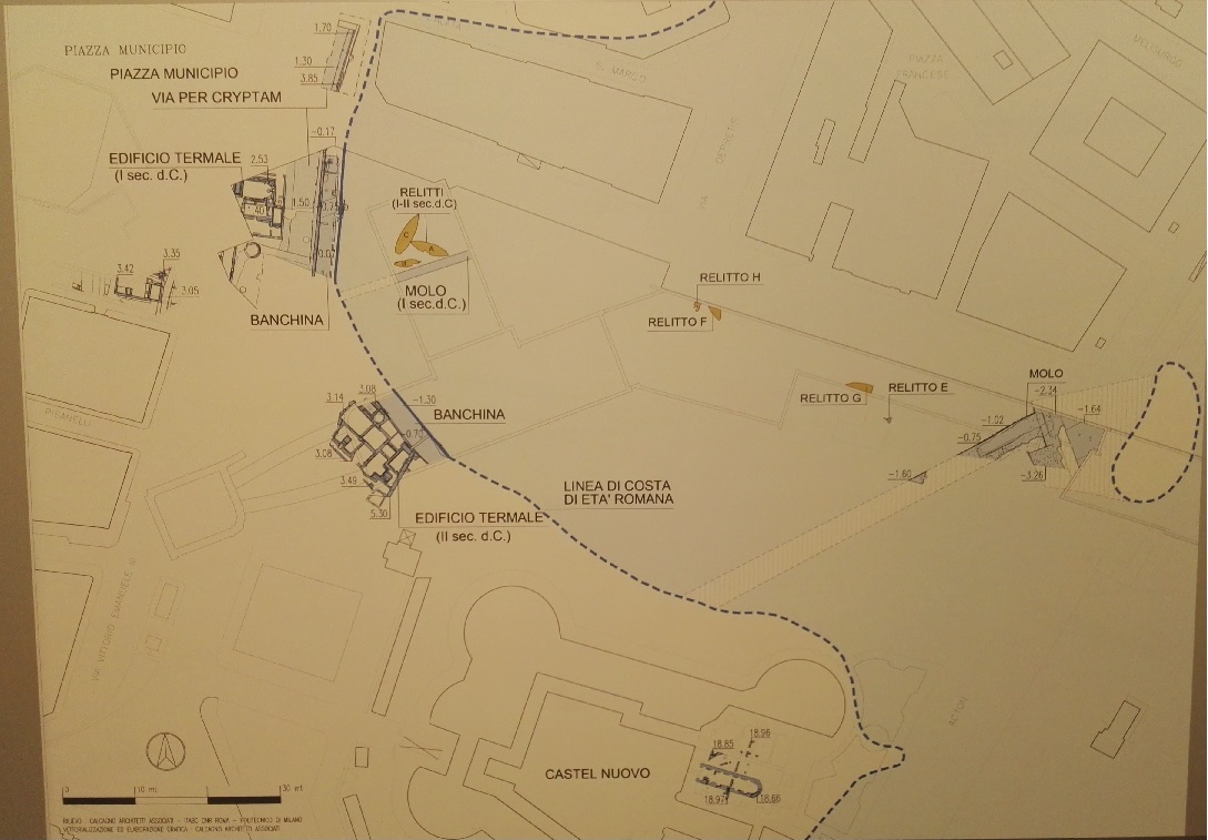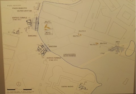 La piantina di Napoli ripropone la linea di costa in età romana con il posizionamento dei relitti trovati nello scavo della metropolitana di Napoli (foto Graziano Tavan)