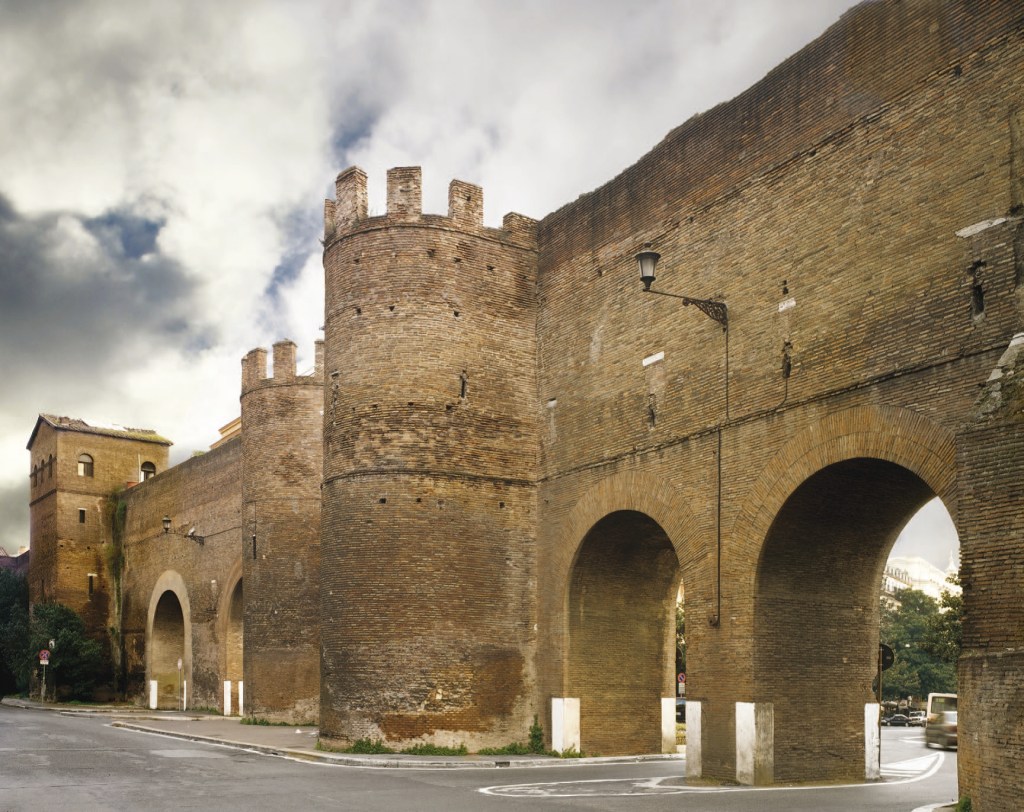 Imponente cornice dell’Urbe, le Mura Aureliane portano i “segni” del suo sviluppo, a partire dalla loro edificazione, voluta dall’imperatore Aureliano tra 271 e 275 per salvaguardare la città da possibili attacchi delle popolazioni barbariche provenienti dall’Europa del Nord, fino ad arrivare ai nostri giorni, attraverso trasformazioni, danneggiamenti, restauri. Il circuito, che originariamente correva per 18,837 chilometri, oggi rimane per una lunghezza di poco più di dodici. Edificate, inglobando monumenti preesistenti che si trovavano lungo il loro tracciato, le Mura sono diventate rapidamente uno dei simboli della città, tanto da attirare l’attenzione dei Papi che, dal XV secolo, hanno lasciato gli stemmi del proprio casato sulla cortina, “firmando” così ogni intervento effettuato.