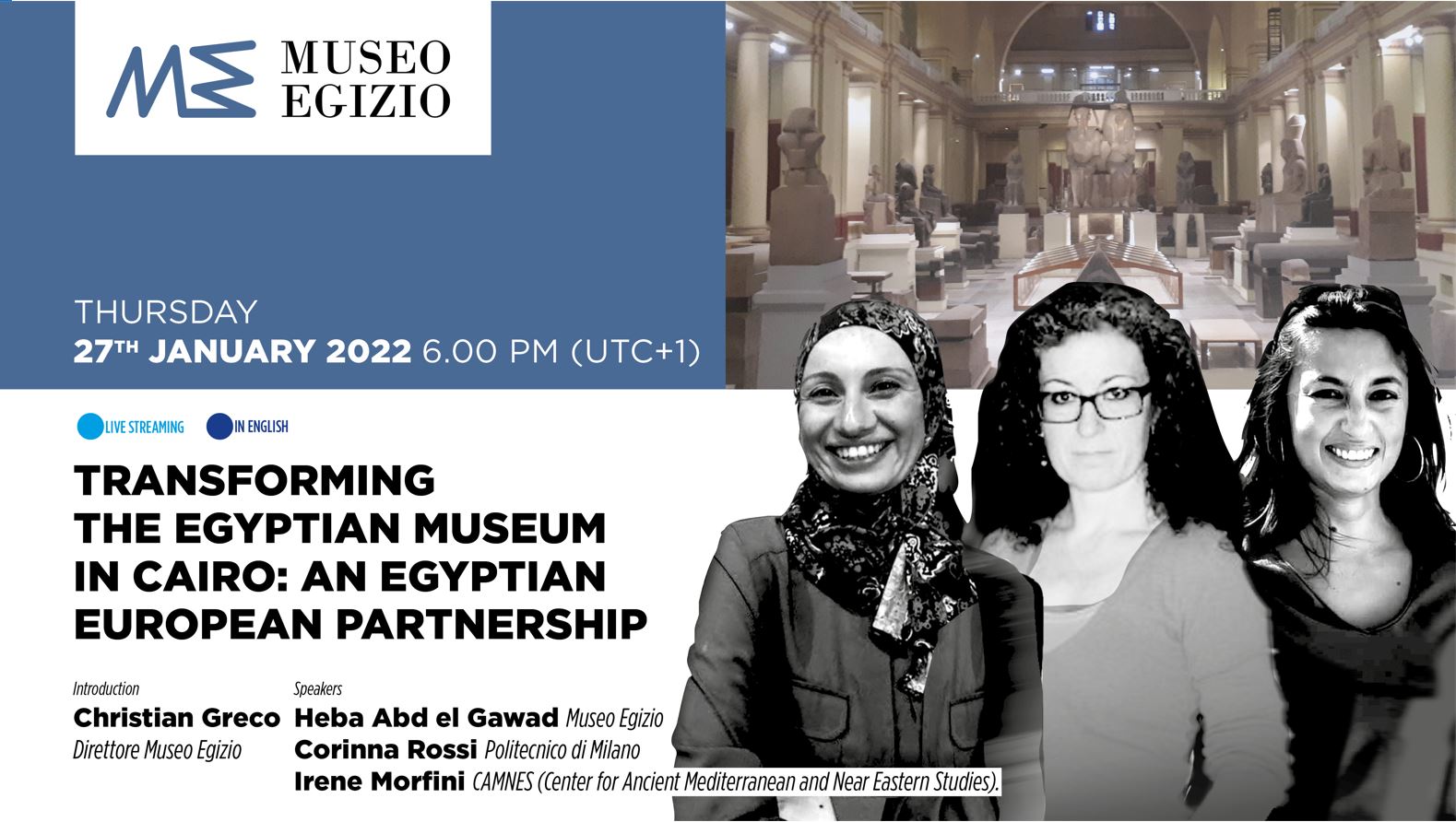 L’imminente apertura del Grand Egyptian Museum e di altri musei regionali in Egitto, ha portato a una redistribuzione degli oggetti che ha interessato il vecchio allestimento del museo di piazza Tahrir. Questa situazione ha rappresentato un’occasione per pensare al futuro del museo e per individuare le direzioni di sviluppo adeguate in modo coordinato. Giovedì 27 gennaio 2022, alle 18, nuovo appuntamento on line con le conferenze del ciclo “Museo e Ricerca. Scavi, Archivi, Reperti” del museo Egizio di Torino. Heba Abd el Gawad, Corinna Rossi e Irene Morfini con la conferenza “Transforming the Egyptian Museum in Cairo: an Egyptian European Partnership” ci guidano alla scoperta del progetto di riallestimento del museo Egizio de Il Cairo. Introduce Christian Greco, direttore del museo Egizio di Torino. La conferenza in inglese si tiene ONLINE sulla pagina Facebook e sul canale YouTube del museo Egizio.