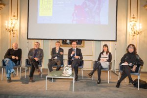 La presentazione della mostra “On the road”: da sinistra, l’architetto Italo Rota, il soprintendente Luigi Malnati, il ministro Graziano Delrio, il sindaco di Reggio Emilia Luca Vecchi, la vicepresidente dell’Emilia Romagna Ottavia Soncini, e il direttore dei civici musei Elisabetta Farioli