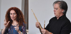 Rapiti da tanta bellezza notiamo solo ora la calda atmosfera che ci ha accolti nel tablino: le dolci note di un flauto riempiono tutta la sala e si diffondono fino al giardino. “È un’antica musica etrusca”, precisa Zito. Proprio Simona Rafanelli con il maestro e compositore Stefano Cocco Cantini da anni sta studiando gli antichi strumenti emersi dagli scavi archeologici e le fonti coeve per recuperare suoni e ritmi della musica etrusca (vedi https://archeologiavocidalpassato.wordpress.com/2014/03/05/dalle-tombe-dipinte-di-tarquinia-alla-musica-perduta-degli-etruschi-a-firenze-live-coinvolgente-con-letruscologa-simona-rafanelli-e-il-jazzista-stefano-cocco-contini/). Sulle note degli antichi etruschi l’occhio comincia a scorrere sulle pareti decorate del tablino, l’ambiente di rappresentanza della casa, che qui ospita una eccezionale quadreria, composti da sedici bellissimi quadri-affreschi, provenienti da Pompei e dall’area vesuviana. “L’allestimento”, interviene Luigi Rafanelli, “suggerisce l’idea di come erano sistemati, nella “pinacoteca” di una villa romana/pompeiana i piccoli dipinti (pinakes) che rappresentavano soggetti mitologici , domestici, naturalistici, con una tecnica pittorica mutuata dai greci. In questo modo diventava uno spazio fantasioso pieno di immagini, da cui l’abitante e l’ospite si sentivano avvolti, così per il visitatore odierno costituisce una immaginifica messa in scena per ritornare con la mente a quei luoghi e a quei tempi”. Gli affreschi, come fa notare l’archeologa Zito, sono stati staccati da soggetti più grandi e ricomposti senza rispettare la sequenza originale ma rispondendo al gusto estetico dell’epoca borbonica. “In questa maniera”, stigmatizza Fiorenza Grasso, “gli scavatori borbonici distruggevano i complessi decorativi da cui i singoli soggetti (amorini, scorci di paesaggi, uccelli, …) erano tratti, e solo in rarissimi casi si ordinava un preventivo disegno dell’intera decorazione”. Gli affreschi o, meglio, i quadretti-affresco nel tablino ricreato di Vetulonia, appartengono per la maggior parte al cosiddetto IV stile pompeiano, definito anche “stile fantastico” che si sviluppa negli ultimi decenni di vita di Pompei prima dell’eruzione: “si torna all’illusione spaziale ottenuta con arditi scorci, quinte sceniche, portici e architetture complesse, baroccheggianti nella fase claudio-neroniana e di ispirazione teatrale”.