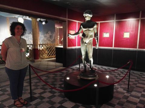 Ti affacci all’uscio e lui, l’Efebo di via dell’Abbondanza, è lì che ti accoglie, il suo sguardo pensoso, il suo portamento solenne, “nell’armonica disposizione del corpo e nella nobile compostezza del volto”, come sottolinea Simona Rafanelli, direttore del museo Archeologico “Isidoro Falchi” di Vetulonia dove, nella mostra “L’Arte di Vivere al tempo di Roma. I luoghi del tempo nelle domus di Pompei” (aperta fino al 5 novembre; catalogo de “L’Erma” di Bretschneider), è stata ricreata una domus pompeiana, con un centinaio di reperti provenienti dalle colonie romane dell’area vesuviana, Pompei, Ercolano, Stabia, e conservati al museo Archeologico nazionale di Napoli. Dopo aver fatto la conoscenza con gli ambienti che davano sull’atrio, il luogo più rappresentativo e privato della domus (vedi https://archeologiavocidalpassato.wordpress.com/2017/08/15/nellatrio-di-una-domus-pompeiana-a-vetulonia-nella-mostra-larte-di-vivere-al-tempo-di-roma-si-scoprono-tesori-e-oggetti-comuni-degli-ambienti-del-cuore-di-una-cas/),continuiamo il nostro viaggio nel tempo e nello spazio sempre accompagnati dall’archeologa Luisa Zito entrando nel tablino, “l’ambiente più importante della mostra”, spiega l’architetto Luigi Rafanelli, che ha curato l’allestimento, “perché ospita il famosissimo Efebo in bronzo, che campeggia al centro di esso, ed è decorato alle pareti da affreschi che formano una immaginaria quadreria”. L’Efebo, a Vetulonia, diversamente da quando era esposto al Paul Getty Museum di Los Angeles (ultima tappa straniera prima del suo rientro in Italia), non è circoscritto da uno spazio delimitato e definito, ma è libero da tutte le parti, in modo che può essere visto e goduto (circostanza eccezionale) dai visitatori a 360°, come sospeso nel tempo e nello spazio. “Non c’è altra luce nella stanza – continua Luigi Rafanelli – se non quella speciale che lo illumina, e il chiarore che proviene dalle pareti con gli affreschi è soffuso e non se ne percepisce la provenienza”.