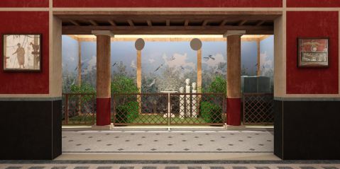 Rendering della vista dal tablino sul giardino chiuso dalla riproduzione del grande affresco della domus pompeiana del Bracciale d’oro