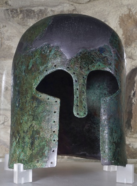 Una panoplia dal museo di Aleria in Corsica in mostra a Vetulonia: la machaira (grande spada a lama ricurva) italica all’elmo Negau di tipo etrusco (foto Graziano Tavan)