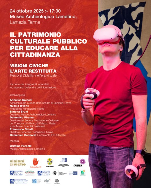 Museo Archeologico Lametino. In collaborazione con l’associazione di promozione sociale “Ambrosia” sabato 25 settembre sarà presentato l’evento “Il diadema del Tesoro di Terina: dal 3D al tattile”. Programma: 17-17.30: visita guidata a misura di bambino (max 15 bambini età 6-8 anni) a cura della diagnosta e tecnico di restauro Felicia Villella; 17.30-18.30: laboratorio di diagnostica junior: “Com’è fatto il diadema?” (max 15 bambini età 6-8 anni) a cura di Felicia Villella; 19.30-21: seminario, che dopo l’introduzione della direttrice Simona Bruni prevede gli interventi di: Francesco La Trofa su “Il tema dell’inclusività nel settore dei Beni Culturali”, Felicia Villella su “L’importanza della comunicazione nel patrimonio culturale” e Gabriele Simonetta su “Dal 3D al tattile, il caso studio del diadema del Tesoro di Terina”. Dalle 17.30 e alle 18.30, previa prenotazione obbligatoria, sarà possibile prendere parte a due visite guidate a cura dell’archeologo Antonio Vescio. Prenotazioni al numero telefonico: 3207984594 o alla e-mail: drm-cal.lametino@beniculturali.it.