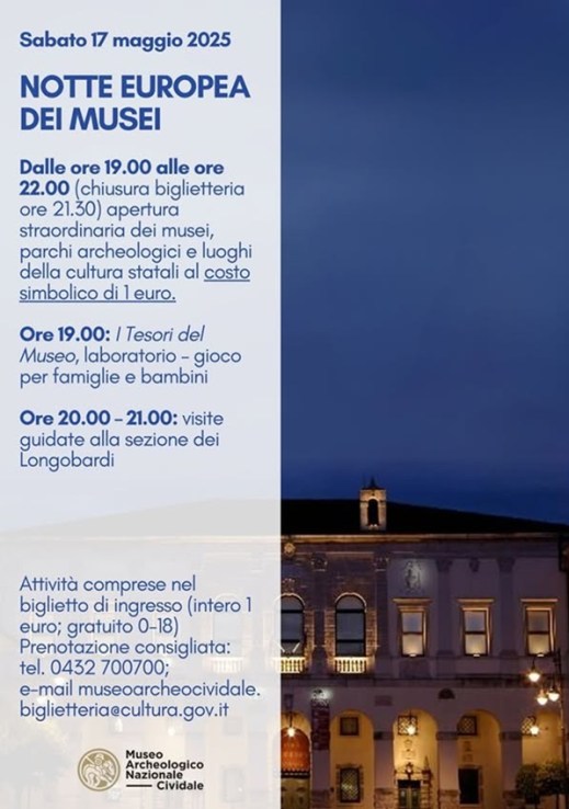 Da febbraio a giugno 2025 il museo Archeologico nazionale di Cividale (Ud) organizza una serie di visite guidate alle collezioni longobarde per scoprire i tesori custoditi nelle sue sale e le storie che li rendono unici. Si comincia sabato 15 febbraio 2025, poi saranno ogni terzo sabato del mese. Sono previsti due turni, alle 10.30 e alle 12, per un viaggio straordinario attraverso l’archeologia, un’occasione per immergersi nella cultura per scoprire storie uniche e affascinanti. Attività gratuita compresa nel biglietto d’ingresso (6 euro intero – gratuito 0-18). Per informazioni e prenotazioni: tel.0432700700.