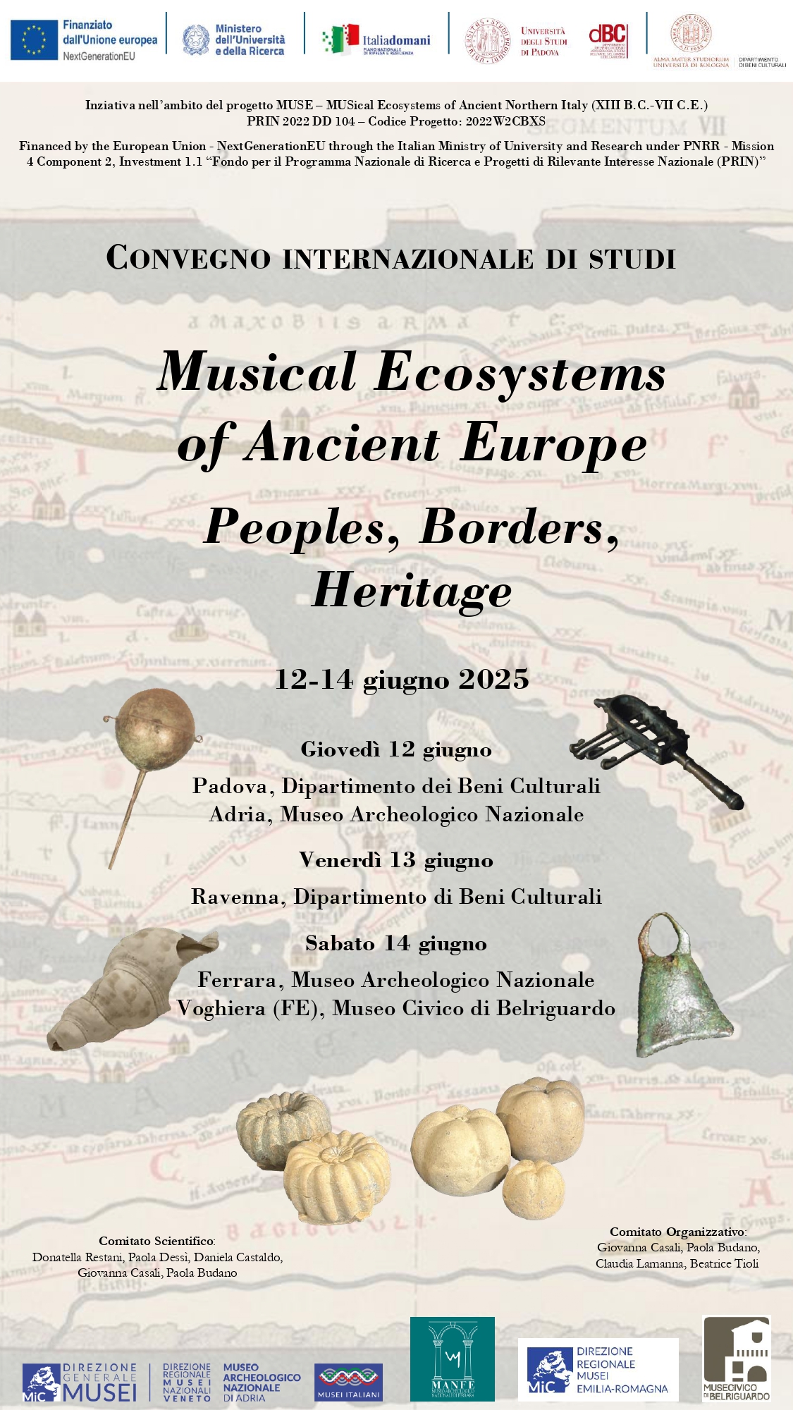 Dal 12 al 14 giugno 2025, il convegno internazionale “Ecosistemi musicali dell’antica Europa. Popoli, confini, patrimonio”: tre giorni di incontri tra Padova, Adria, Ravenna, Ferrara e Voghiera per esplorare il mondo sonoro dell’antichità: strumenti musicali, pratiche acustiche, oggetti sonori e il loro significato nei contesti archeologici e culturali dell’Europa antica. Il convegno, parte del progetto PRIN MUSE – MUSical Ecosystems of Ancient Northern Italy, riunisce esperti da tutta Europa per discutere il valore del patrimonio musicale antico, tra ricerca, conservazione e valorizzazione museale. Convegno in presenza e in diretta streaming sui canali YouTube dei Dipartimenti.