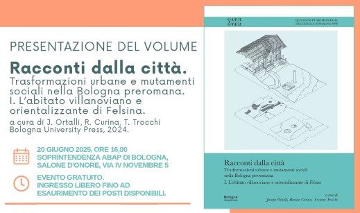 Venerdì 20 giugno 2025, alle 16, nella sede SABAP-BO di Palazzo Marescalchi, in via IV Novembre 5 a Bologna, presentazione del libro “Racconti dalla città. Trasformazioni urbane e mutamenti sociali nella Bologna preromana. I. L’abitato villanoviano e orientalizzante di Felsina” a cura di Jacopo Ortalli, Renata Curina, Tiziano Trocchi (BUP, Bologna, 2024), volume n. 8 della collana monografica ‘Quaderni di Archeologia dell’Emilia-Romagna, Nuova Serie’. Ingresso libero fino ad esaurimento dei posti disponibili. Dopo i saluti di Francesca Tomba, soprintendente ABAP di Bologna, introduce Sara Campagnari, responsabile area funzionale Patrimonio archeologico soprintendenza ABAP di Bologna. Intervengono Giovanna Gambacurta, professoressa associata dipartimento di Studi umanistici, università Ca’ Foscari Venezia; Luigi Malnati, già direttore generale MiBAC. Saranno presenti i curatori Jacopo Ortalli, già professore associato dipartimento di Studi umanistici, sez. di Storia e Scienze dell’Antichità, università di Ferrara; Renata Curina, già funzionaria archeologa soprintendenza ABAP di Bologna; Tiziano Trocchi, Musei nazionali di Bologna, direzione regionale Musei nazionali Emilia Romagna – Musei nazionali di Ferrara. direttore del museo Archeologico nazionale di Ferrara.