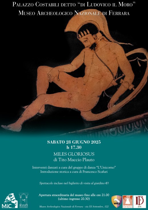 Sabato 28 giugno 2025, alle 17.30, al museo Archeologico nazionale di Ferrara viene rappresentato il “Miles gloriosus. Il soldato fanfarone”, una delle più divertenti commedie di Tito Maccio Plauto, che racconta le disavventure di Pirgoplinice, un vanaglorioso militare tanto pieno di sé quanto facilmente ingannabile. Lo spettacolo, arricchito da interventi danzanti eseguiti dal gruppo danza “L’Unicorno”, sarà presentato e introdotto dallo storico e scrittore Francesco Scafuri. L’iniziativa è a cura della Contrada di Santa Maria in Vado e dell’associazione Bal’danza. In questa occasione il museo effettuerà un’apertura straordinaria fino alle 21 (ultimo ingresso ore 20.30). Lo spettacolo è incluso nel biglietto di visita al giardino: 1 euro. Bigliettazione ordinaria nel caso si preferisca includere la visita all’intero museo.