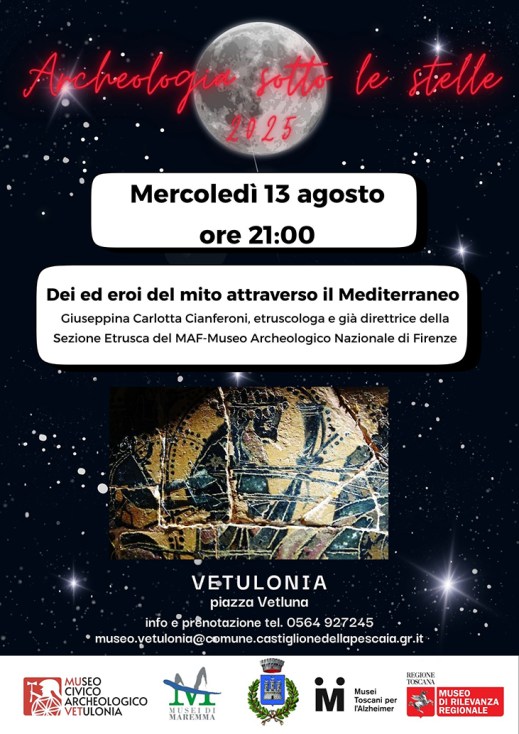 Aspettando la mostra evento 2025 “Un mecenate e i suoi tesori. La collezione archeologica di Roberto Bilotti Ruggi d’Aragona a Roma” che sarà inaugurata sabato 16 agosto 2025, al museo civico Archeologico “Isidoro falchi” di Vetulonia (Castiglione della Pescaia, Gr), per la rassegna “Archeologia sotto le stelle 2025” al MuVet conversazione archeologica “Dei ed eroi attraverso il Mediterraneo” con Giuseppina Carlotta Cianferoni, etruscologa e già direttrice della Sezione Etrusca del MAF-museo Archeologico nazionale di Firenze. Appuntamento mercoledì 13 agosto 2025, alle 21, in piazza Vetluna a Vetulonia. Ingresso libero. Info e contatti: 0564 927245; museo.vetulonia@comune.castiglionedellapescaia.gr.it