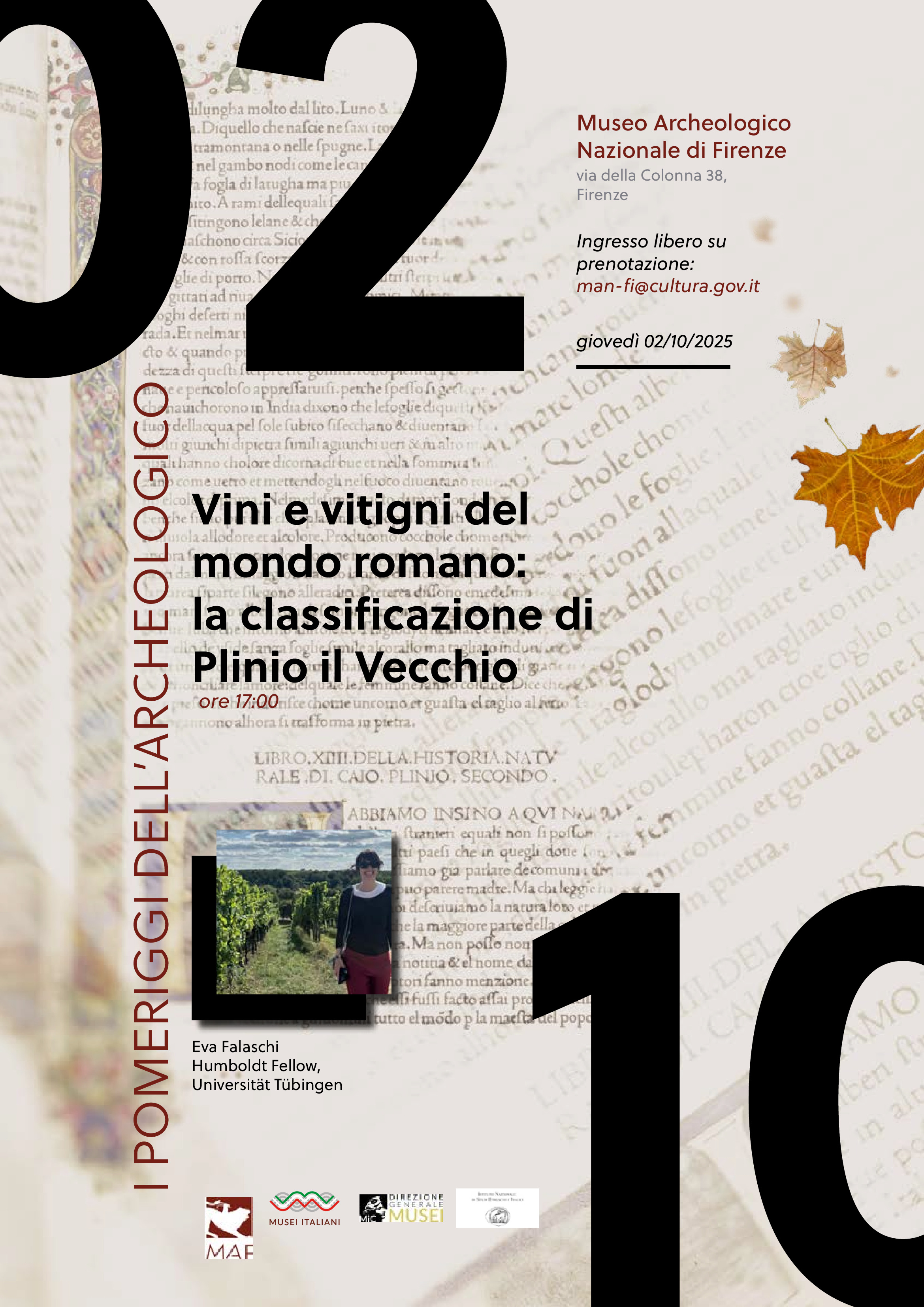 Al museo Archeologico nazionale di Firenze ricomincia la rassegna dei “Pomeriggi dell’Archeologico” con la conferenza di Eva Falaschi (Humboldt Fellow, Universität Tübingen) “Vini e vitigni del mondo romano: la classificazione di Plinio il Vecchio”: appuntamento al MAF giovedì 2 ottobre 2025, alle 17; ingresso gratuito solo su prenotazione obbligatoria scrivendo all’indirizzo: man-fi@cultura.gov.it. La Naturalis Historia di Plinio il Vecchio è uno dei testi principali per conoscere la viticoltura, la vinificazione e il consumo di vino in epoca romana. Plinio restituisce due lunghe liste di vitigni e di vini, che rappresentano un unicum nella letteratura latina e il più antico tentativo di classificazione sopravvissuto nella storia europea. Ma quali criteri lo guidano nel costruire la sua descrizione di un fenomeno che ha plasmato la società e la cultura romane, e non solo?