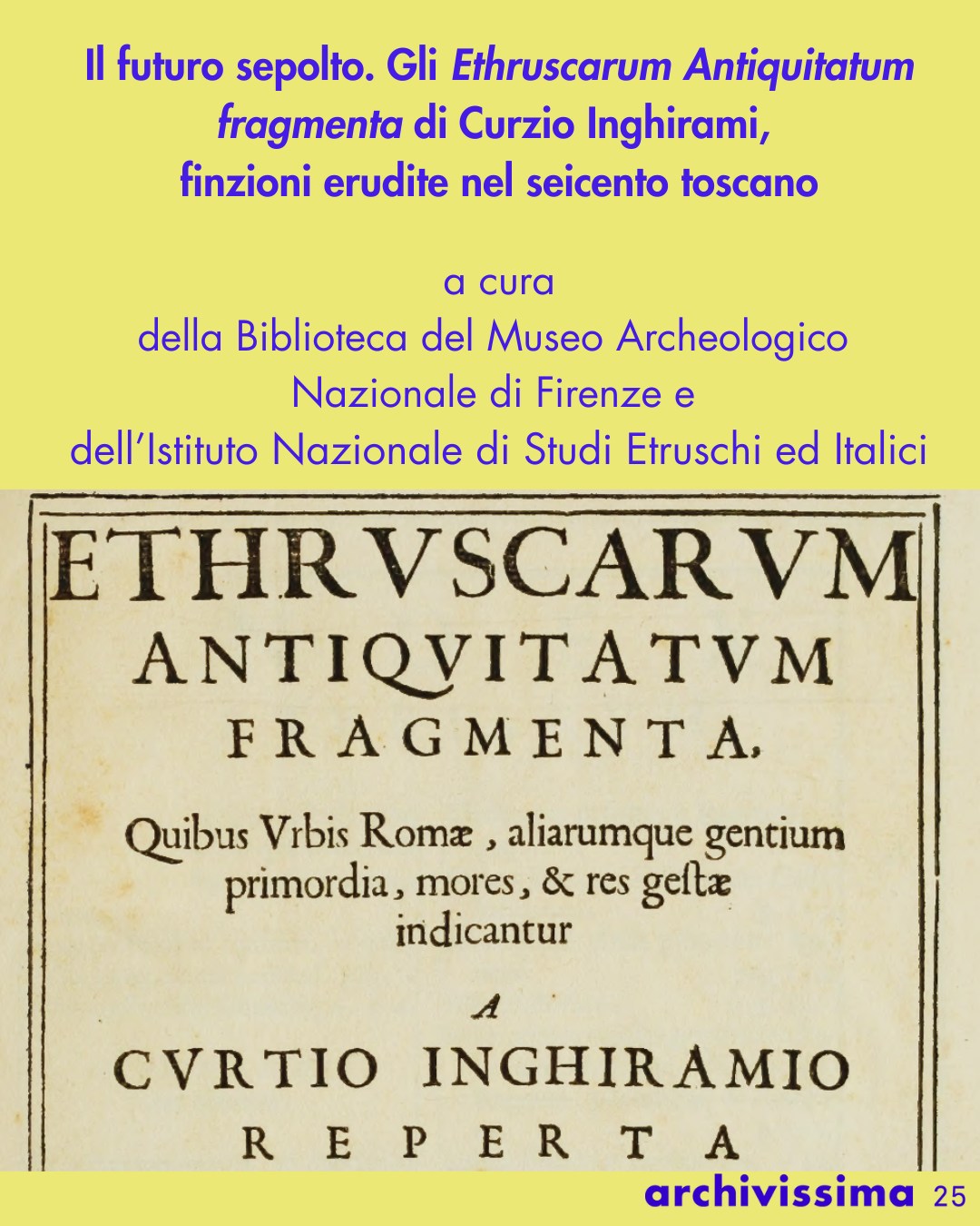 Si parte dalla Biblioteca del museo Archeologico nazionale di Firenze e dall’istituto nazionale di Studi etruschi ed italici con “Il futuro sepolto. Gli Ethruscarum Antiquitatum fragmenta di Curzio Inghirami, finzioni erudite nel seicento toscano”, un viaggio tra mito e archeologia alla scoperta di uno straordinario falso seicentesco, gli “Ethruscarum Antiquitatum Fragmenta” di Curzio Inghirami. Per l’occasione, sarà esposto il rarissimo originale del 1637.