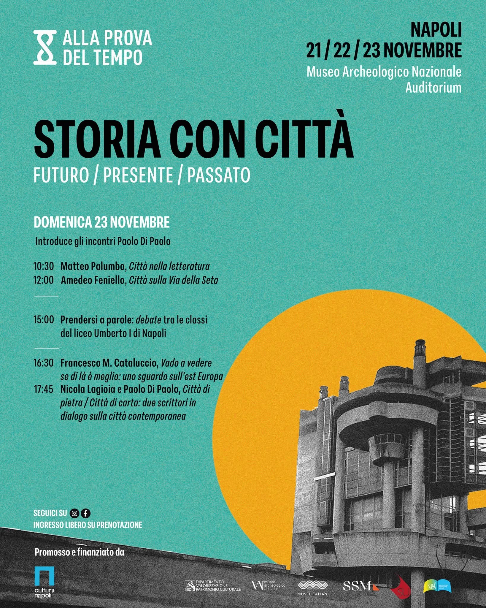 Domenica 23 novembre 2025. Alle 10.30, Lectio magistralis di Matteo Palumbo, “Città nella letteratura”; 12, Amedeo Feniello, “Città sulla Via della Seta”; 15, Debate fra studenti delle scuole medie superiori; 16.30, Francesco M. Cataluccio, “Vado a vedere se di là è meglio: uno sguardo sull’est Europa”; 17.45, Nicola Lagioia e Paolo Di Paolo, “Città di pietra / Città di carta: due scrittori in dialogo sulla città contemporanea”.