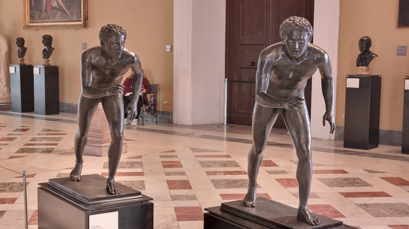 Le statue in bronzo degli atleti provenienti dalla Villa dei Papiri, attualmente visibili nel salone della Meridiana al Mann (foto graziano tavan)