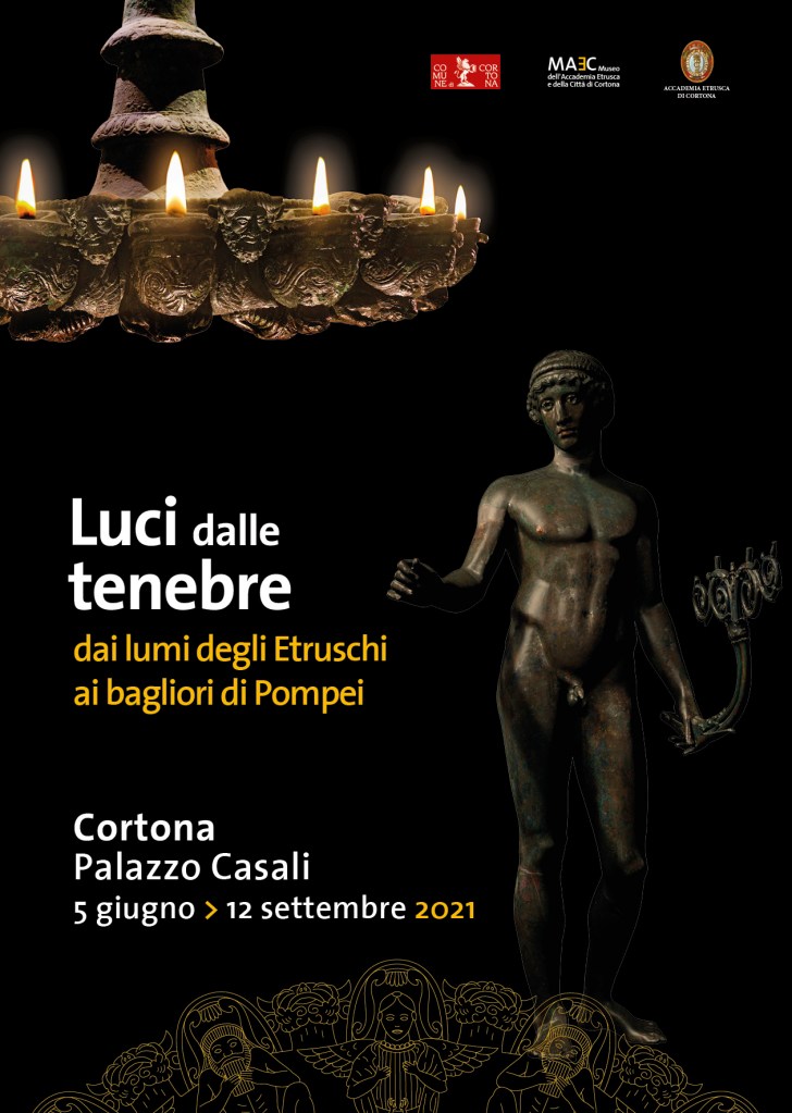 La mostra “Luci dalle tenebre. Dai lumi degli Etruschi ai bagliori di Pompei” al museo dell’Accademia etrusca e della Città di Cortona (Maec) si è chiusa il 12 settembre 2021: in assoluto la prima mostra dedicata all’illuminazione nel mondo etrusco con reperti giunti dai più prestigiosi Musei italiani, una esposizione interamente dedicata alle tecniche di illuminazione e ai rituali connessi nell’epoca etrusca (vedi Cortona. Ancora poche settimane per visitare la mostra “Luci dalle tenebre, dai lumi degli Etruschi ai bagliori di Pompei” al MAEC – museo dell’Accademia etrusca e della Città di Cortona, la prima mostra dedicata all’illuminazione nel mondo etrusco | archeologiavocidalpassato). A distanza di poco più di un mese sabato 16 ottobre 2021, alle 16, in sala Medicea di Palazzo Casali a Cortona, sede del Maec, “Considerazioni conclusive sulla mostra Luci dalle tenebre” a cura del prof. Luigi Donati, lucumone dell’Accademia Etrusca di Cortona. Seguirà la presentazione del catalogo. Green pass e prenotazione obbligatori: 0575637235 – prenotazioni@cortonamaec.org.
