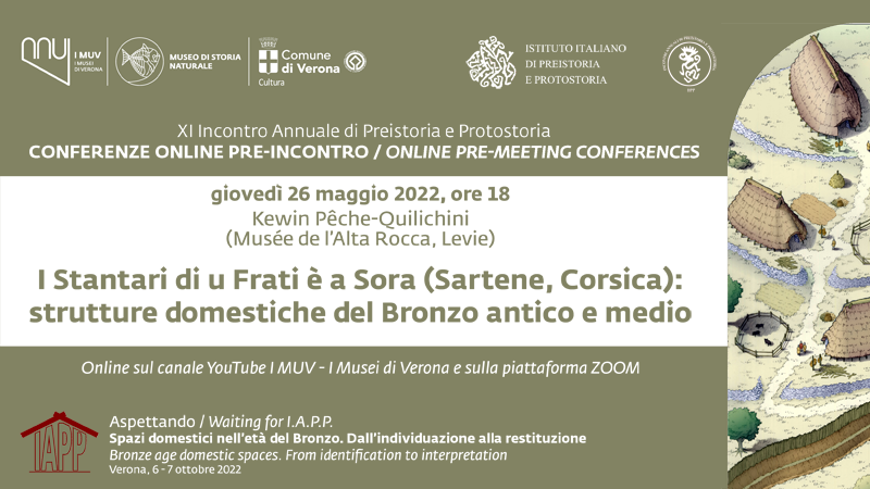 Giovedì 26 maggio 2022, alle 18, quarto appuntamento online sul canale YouTube de I Musei di Verona (I MUV) e sulla piattaforma Zoom con le conferenze preparatorie all’XI Incontro Annuale di Preistoria e Protostoria “Spazi domestici nell’età del bronzo. Dall’individuazione alla restituzione”. L’XI Incontro Annuale di Preistoria e Protostoria – in programma il 6 e 7 ottobre 2022 nella “Sala Ruffo” del museo civico di Storia naturale di Verona e organizzato in collaborazione con l’IIPP – Istituto italiano di Preistoria e Protostoria di Firenze, affronterà infatti gli aspetti legati al tema “casa” emersi da scavi recenti, in corso e/o inediti in contesti dell’età del Bronzo. In programma l’intervento di Kewin Pêche-Quilichini (Musée de l’Alta Rocca, Levie) su “I Stantari di u Frati è a Sora (Sartene in Corsica): strutture domestiche del Bronzo antico e medio”. A introdurre il relatore sarà Massimo Saracino del museo di Storia naturale di Verona; l’evento online sarà moderato da Laura Pau (archeologa, membro del Comitato scientifico) e vedrà la partecipazione di Monica Miari dell’IIPP – Istituto italiano di Preistoria e Protostoria di Firenze, e Paola Bianchi, coordinatrice degli eventi. Per partecipare all’incontro: link YouTube http://bit.ly/YouTubeIMUV.
