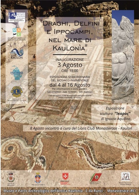 La locandina dell’esposizione temporanea del Mosaico dei draghi e dei delfini nel parco archeologico dell’Antica Kaulon