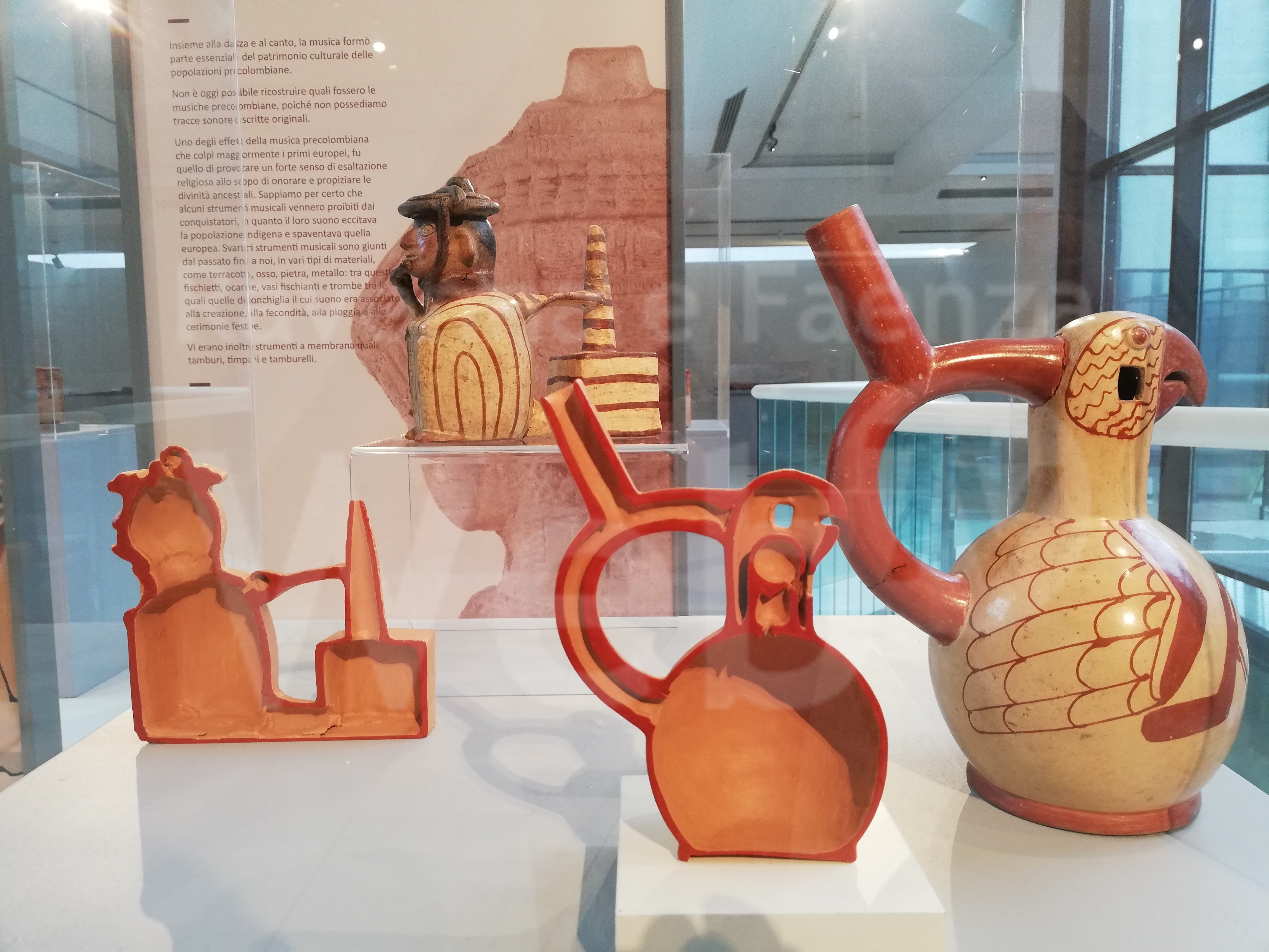 “Svariati strumenti musicali sono giunti dal passato fino a noi, in vari tipi di materiali: terracotta, osso, conchiglia, pietra, metallo, legno, canna e altri materiali di origine vegetale. Assieme a danza e canto, la musica formò parte essenziale del patrimonio culturale delle popolazioni precolombiane: miti e leggende ci parlano della sua origine divina che la ha destinata sia a repertori secolari e domestici (divertimento, festa, iniziazione, matrimonio, guerra, terapia magica delle malattie, corredo funebre) sia a complemento di rituali (rito e sacrificio, scongiuro di calamità cosmiche e naturali, riti agrari, riti dedicati alle forze naturali erette a personalità mitiche, offerte a montagne e vulcani). La musica indigena scaturisce dalla popolazione di cui riflette credenze, usi e ambiente, contribuendo a formare parte del proprio patrimonio inalienabile”. Di questo fondamentale patrimonio la mostra faentina da conto, sia attingendo alle immagini e alle forme di ceramiche qui esposte, sia con l’esposizione di strumenti originali. Utilizzati, forse per l’unica ed ultima volta, per creare la suggestiva colonna sonora di questa magica, imperdibile esposizione.