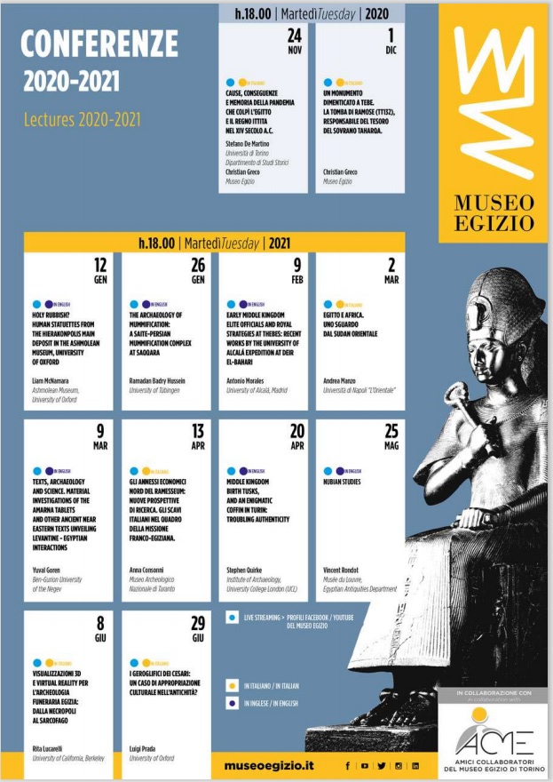 La cura e la cultura: per la stagione 2020/21 il museo Egizio di Torino “raddoppia” con due calendari di conferenze egittologiche, tutte online. A novembre il museo Egizio dà il via al proprio programma di conferenze scientifiche, che per la stagione 2020/2021 si presenta con un doppio calendario di incontri interamente online, incentrati sui temi di ricerca e di indagine egittologica, museale e archivistica, che vedrà alternarsi ricercatori internazionali e curatori del museo. L’istituzione, in linea con i propri principi e le proprie finalità, si propone quindi di diventare un palcoscenico dove egittologi e la comunità scientifica tutta raccontino le ricerche e gli studi condotti rendendoli accessibili a un pubblico ampio, che riunisce addetti ai lavori, appassionati e curiosi. Tutti gli appuntamenti verranno trasmessi in diretta streaming sulla pagina Facebook e sul canale YouTube del museo Egizio. “Uno dei compiti propri di un museo è quello di rendere visibile la ricerca che compie diffondendo i risultati degli studi compiuti e mettendoli a disposizione della comunità scientifica e del pubblico”, dichiara Christian Greco, direttore del museo Egizio. “Un’ambizione che in questo periodo assume una centralità ancora più forte perché ci permette di coltivare e mantenere vivo il fondamentale legame tra il museo e il suo pubblico, oltre che con la comunità scientifica nazionale e internazionale. Questo è possibile grazie a tutti coloro che seguono il museo Egizio e che possono esserne parte attiva non solo visitandolo, ma anche supportandone le attività di ricerca”.