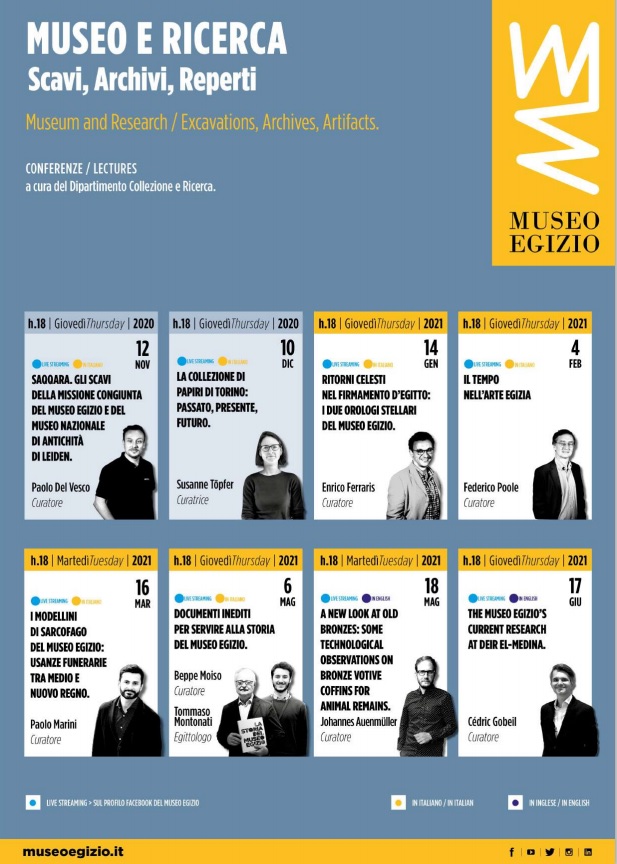 La novità di quest’anno è invece rappresentata dal ciclo di conferenze “Museo e Ricerca. Scavi, Archivi e Reperti”, che vedrà come protagonisti i progetti di ricerca curati dal Dipartimento Collezione e Ricerca del museo Egizio. Un modo per dare evidenza e centralità agli studi in corso sulla collezione, che comprendono sia approfondimenti specifici su singoli reperti o contesti archeologici, sia progetti di più ampio respiro e di interesse generale, sempre connessi alla cultura materiale custodita in museo. Sarà proprio con un incontro tenuto da uno dei curatori del Museo che inizierà la programmazione, che proseguirà fino al mese di giugno 2021: giovedì 12 novembre 2020 alle 18, infatti, sarà una conferenza a cura di Paolo del Vesco sugli scavi della missione congiunta del museo Egizio e del museo Nazionale di Antichità di Leiden a Saqqara a inaugurare la nuova stagione di conferenze egittologiche dell’istituzione.