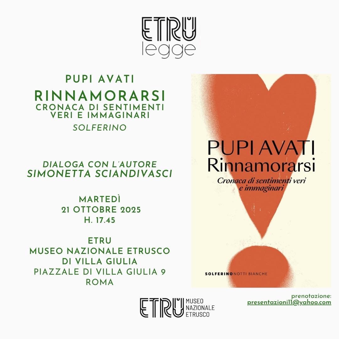Per il ciclo ETRUlegge, martedì 21 ottobre 2025, alle 17.45, al museo nazionale Etrusco di Villa Giulia presentazione del nuovo libro di Pupi Avati “Rinnamorarsi. Cronaca di sentimenti veri e immaginari” (Solferino libri). L’autore dialogherà con Simonetta Sciandivasci. Ingresso libero in sala fortuna fino ad esaurimento posti. Prenotazione consigliata all’indirizzo mail: presentazioni11@yahoo.com