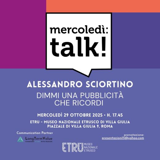 Ultimo appuntamento con “MERCOLEDÌ TALK!”, la nuova rassegna culturale del museo nazionale Etrusco di Villa Giulia che esplora temi e argomenti diversi e che stimola un dialogo curioso tra pubblico e specialisti. La rassegna, curata da Maddalena Santeroni per l’Associazione Amici dell’Arte Moderna a Valle Giulia, si svolge il mercoledì e ogni incontro è dedicato ad un tema specifico: arte, cinema, storia, psicoanalisi, poesia. Mercoledì 29 ottobre 2025, alle 17.45, in sala Fortuna, al museo nazionale Etrusco di Villa Giulia, 45 Alessandro Sciortino, Chief Creative Officer di McCann Worldgroup Italy, nell’incontro “Dimmi una pubblicità che ricordi” svelerà i i segreti che si nascondono dietro tutto quello che fa pubblicità. Ingresso gratuito in sala fortuna fino ad esaurimento posti. Prenotazione obbligatoria all’indirizzo mail presentazioni11@yahoo.com.