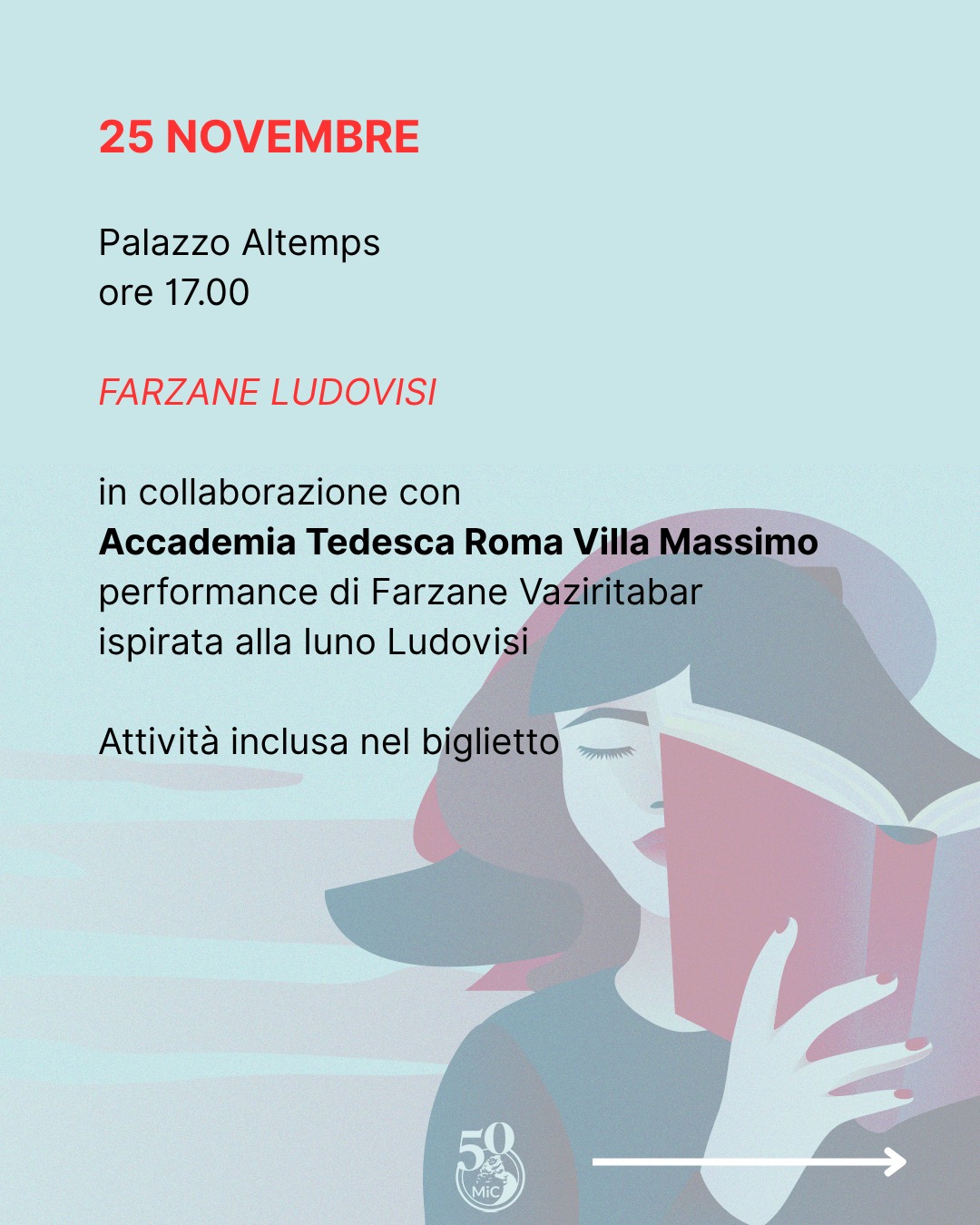 17, Palazzo Altemps, “Farzane Ludovisi”: performance di Farzane Vaziritabar, dell’Accademia Tedesca Roma Casa Baldi. Attraverso la presenza, il movimento e la voce dell’artista, la Iuno Ludovisi prende nuova vita: da simbolo di bellezza femminile idealizzata diviene una manifestazione della donna attiva, politica e viva, in un dialogo prolungato tra la pietra e la presenza, la storia e la voce di oggi. Attività inclusa nel costo del biglietto.