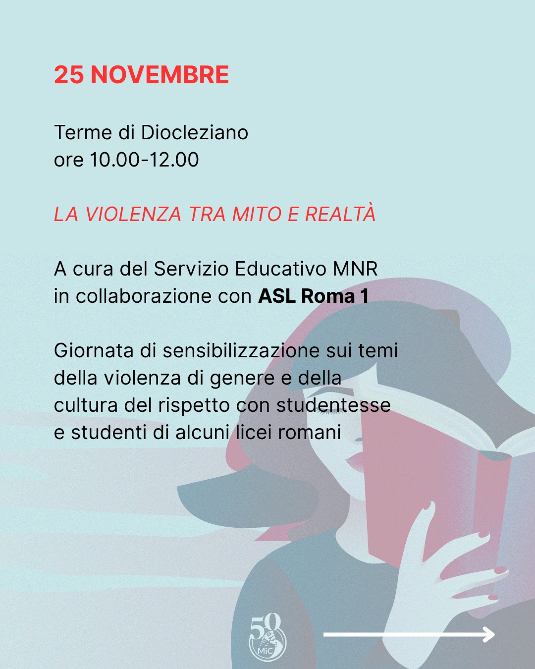 10 – 12, Terme di Diocleziano, “La violenza tra mito e realtà”: percorso didattico per ripercorrere e interpretare i miti del mondo classico dedicato agli studenti del liceo ginnasio statale “Cornelio Tacito” e del polo liceale “Alighieri – Caravillani” liceo classico “Dante Alighieri” di Roma e del liceo artistico “Angelo Frammartino di Monterotondo”, con il supporto di psicologi della Asl Roma 1.