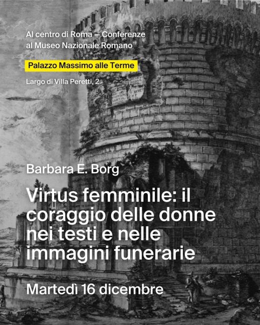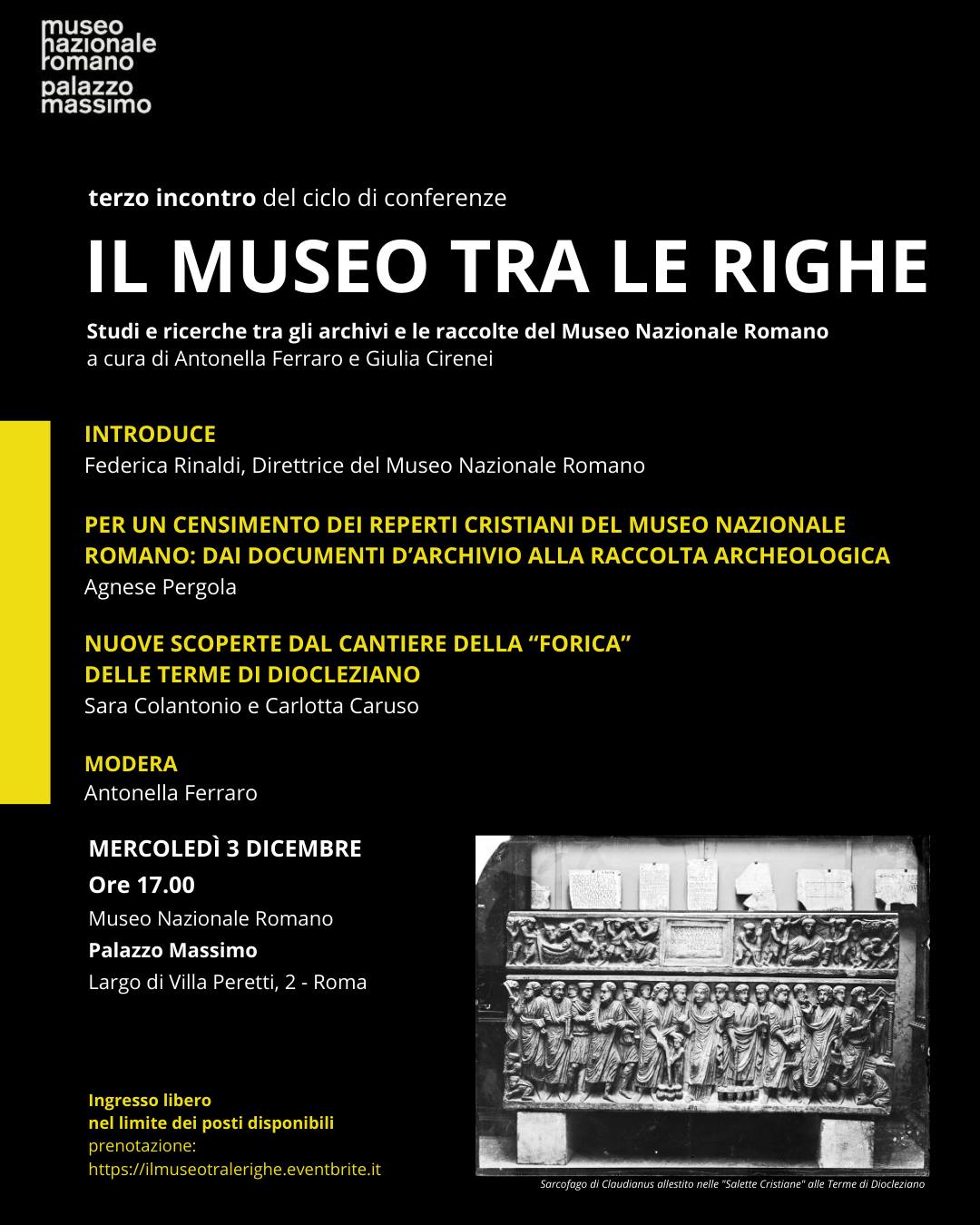 Mercoledì 3 dicembre 2025, alle 17, a Palazzo Massimo, nuova conferenza del ciclo “Il Museo tra le righe. Studi e ricerche tra gli archivi e le raccolte del Museo Nazionale Romano” a cura di Giulia Cirenei e Antonella Ferraro, che presenta al pubblico gli studi e le ricerche condotte dal personale scientifico del Museo. Introduce Federica Rinaldi, direttrice del museo nazionale Romano; intervengono Agnese Pergola su “Per un censimento dei reperti cristiani del museo nazionale Romano: dai documenti d’archivio alla raccolta archeologica”; Sara Colantonio e Carlotta Caruso su “Nuove scoperte dal cantiere della “forica” delle Terme di Diocleziano”. Modera Antonella Ferraro. Ingresso libero nel limite dei posti disponibili. Prenotazione obbligatoria: www.ilmuseotralerighe.eventbrite.it.