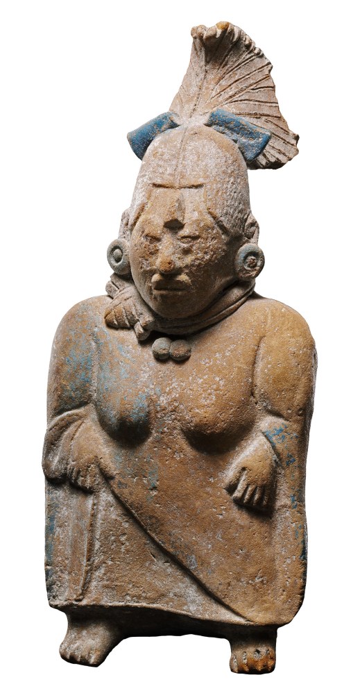 Figura femminile con funzione di sonaglio in ceramica con decorazione policroma. Cultura Maya, 600-800 d.C. (collezione Ligabue)