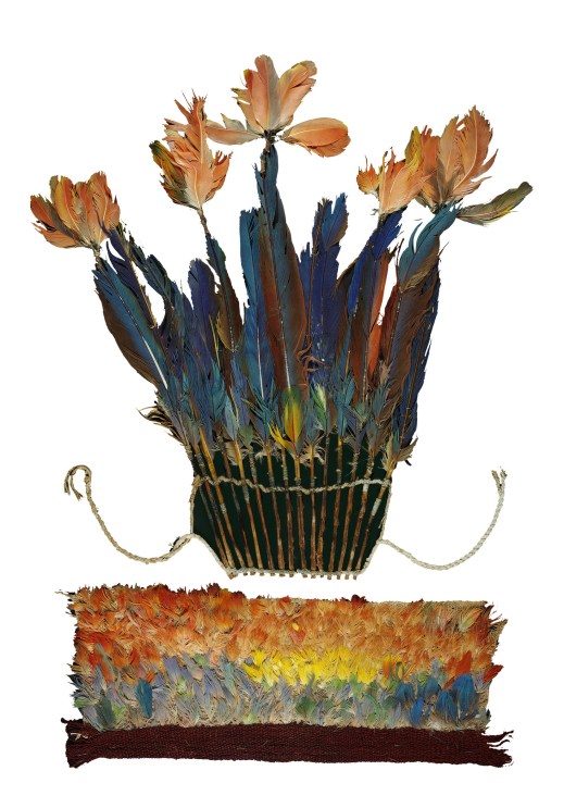 Uno straordinario copricapo e un tessuto della cultura Nazca (200 a.C.) con piume di uccelli amazzonici e corda (collezione Ligabue)