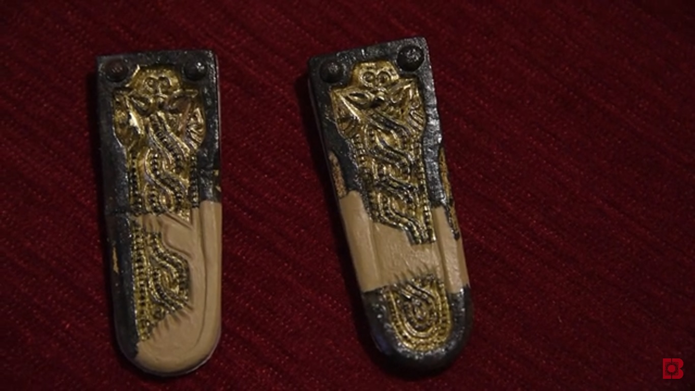 Linguette in bronzo dorato dalla tomba longobarda della principessa di Civezzano conservati al museo del Buonconsiglio (foto Buonconsiglio)