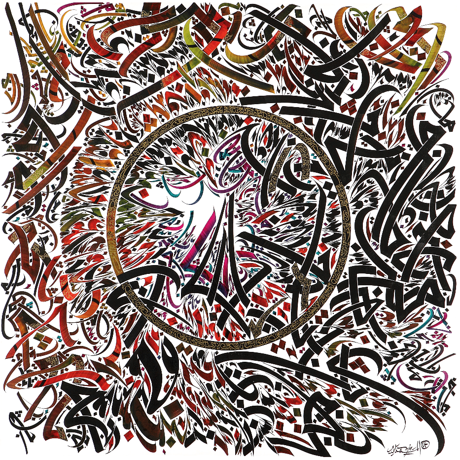 Mahdaoui, nato a Tunisi nel 1937, ha iniziato la sua carriera come pittore astratto negli anni ’60, poi ha continuato sperimentando la calligrafia araba. L’artista ha provato vari media tradizionali e sperimentali. Ha prodotto i suoi primi dipinti su pergamena nel 1972, si è interessato alla tessitura e alla produzione di tappeti nel 1979 e ha iniziato a dipingere su pelli di animali e sul corpo umano nel 1980. Oggi è conosciuto come “l’inventore della calligrafia astratta”, poiché i suoi disegni ricordano le lettere arabe, ma non hanno alcun significato letterale. Ha iniziato a utilizzare i suoi “calligrammi” personali su vari mezzi come: tela, papiro, scultura, alluminio, ottone, tamburo, tessuto, ricamo, arazzo, ceramica, legno, gioielli, vetro in acciaio colorato, aerei. Mahdaoui appartiene a quella generazione di artisti arabi che hanno studiato all’estero ma hanno cercato ispirazione dalle loro radici tradizionali.