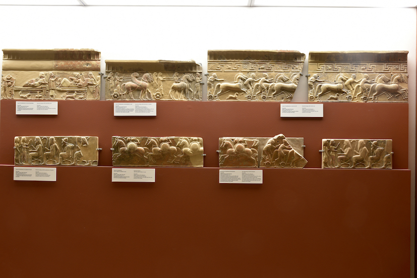 Per concludere il percorso virtuale sugli Etruschi al Mann, un’incursione nella seconda sezione della mostra: le terrecotte architettoniche dal “tempio delle stimmate” di Velletri fanno parte del patrimonio del museo Archeologico nazionale di Napoli perché tesori della Collezione Borgia. Si tratta di lastre di rivestimento degli elementi in legno della trabeazione (550-525 a.C.), in cui possiamo cogliere la raffigurazione di una processione di cavalieri e carri, dell’apoteosi di Eracle all’Olimpo e di una scena di banchetto.