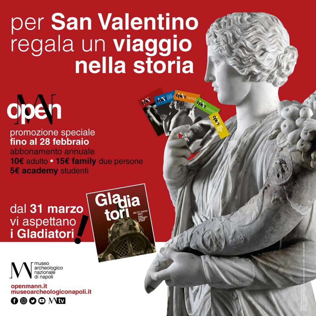 Sempre in occasione del fine settimana, ed in particolare di San Valentino, sarà promossa la campagna di abbonamento annuale OpenMann: con lo slogan “Regala un viaggio nella storia”, saranno rilanciate le card ai prezzi promo di 10 euro per adulto, 15 per coppie di over 25 anni e 5 per Academy (studenti e specializzandi senza limiti di età).