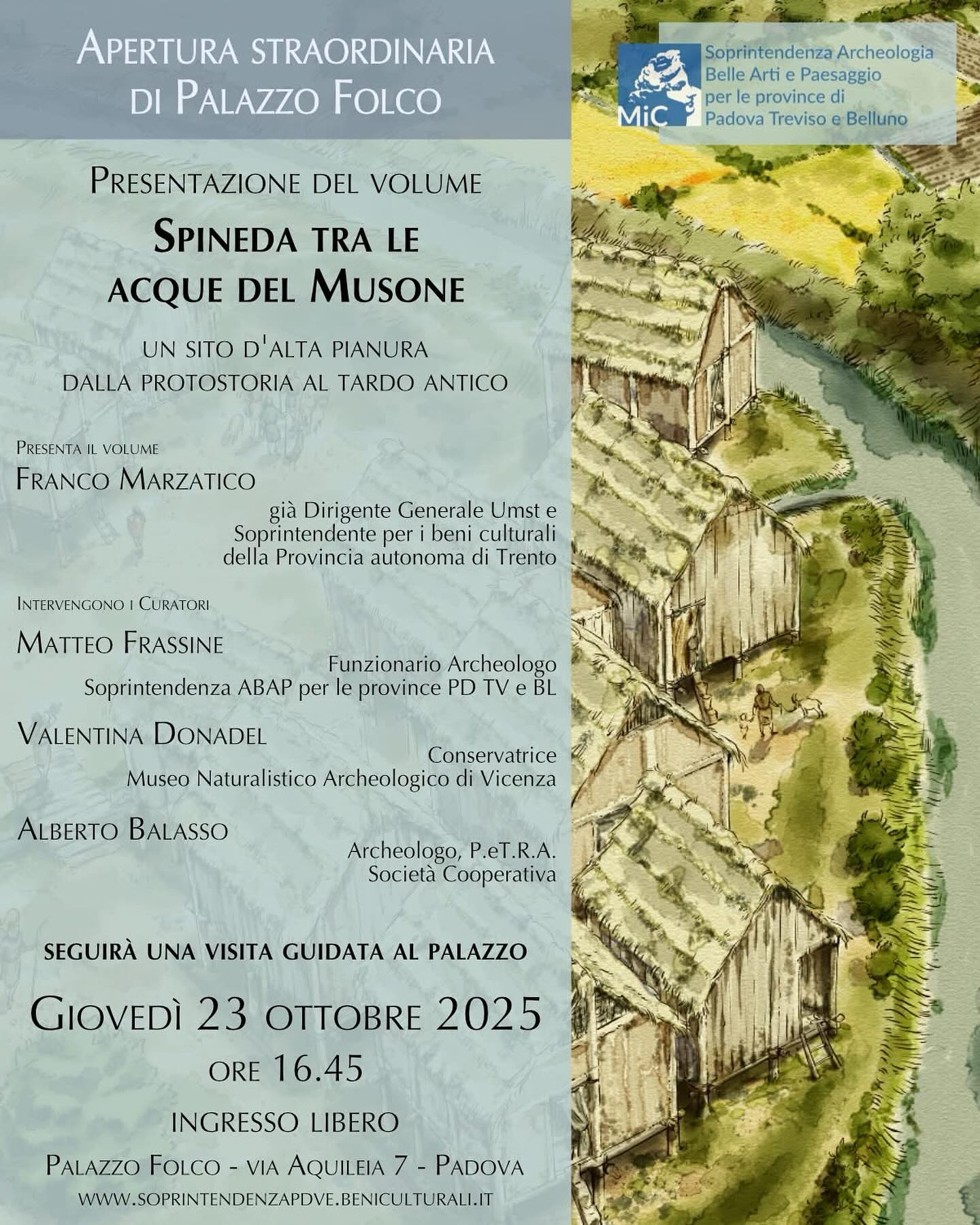 Per il ciclo di conferenze ospitate a Palazzo Folco, sede della Soprintendenza a Padova, con apertura straordinaria nell’ambito del Piano di Valorizzazione dei luoghi della cultura 2025, appuntamento alle 16.45 a Palazzo Folco in via Aquileia a Padova, per la presentazione del libro “Spineda tra le acque del Musone – Un sito d’alta pianura dalla protostoria al tardo antico” a cura di Matteo Frassine, Valentina Donadel, Alberto Balasso. Presenta il volume Franco Marzatico, già dirigente generale unità di missione strategica soprintendenza per i Beni e le Attività culturali della Provincia autonoma di Trento. Intervengono i curatori Matteo Frassine, funzionario archeologo soprintendenza ABAP per le province di Pd, Tv e Bl; Valentina Donadel, conservatrice museo Naturalistico Archeologico di Vicenza; Alberto Balasso, archeologo P.eT.R.A. Società Cooperativa. Dopo la presentazione del volume, seguirà una visita guidata a Palazzo Soranzo Cappello, a cura del personale della Soprintendenza.