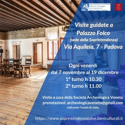 Grazie alla collaborazione tra la soprintendenza Archeologia Belle arti e Paesaggio di Padova Treviso e Belluno, e la Società Archeologica Veneta, sono in programma ogni venerdì, dal 7 novembre al 19 dicembre 2025, visite guidate a Palazzo Folco, in via Aquileia 7 a Padova, sede della Sabap di Padova. Le visite, a cura della Società Archeologica Veneta, sono su due turni, alle 10.30 e alle 11, il 7, 14, 21, e 28 novembre 2025, e il 5, 12 e 19 dicembre 2025. Le visite sono gratuite con prenotazione obbligatoria scrivendo a: archeologicaveneta@gmail.com indicando il turno di visita scelto.