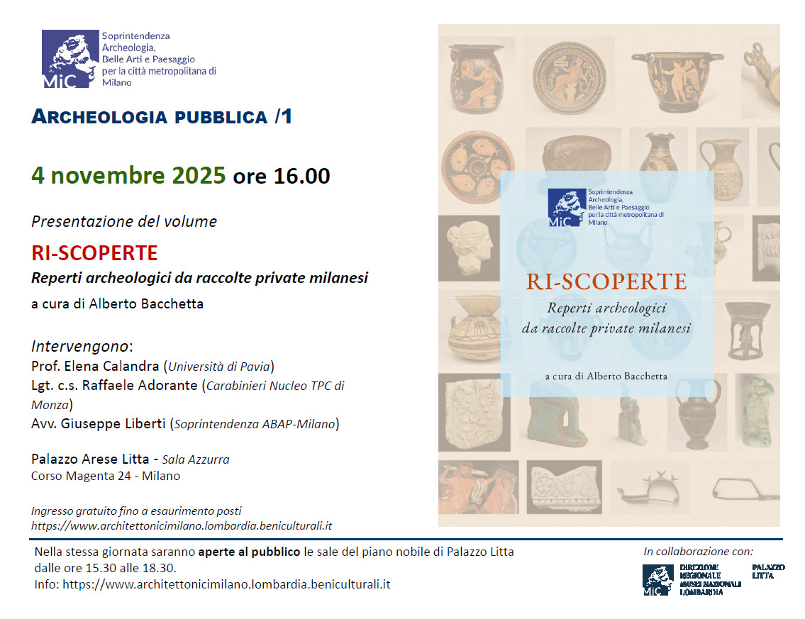 Martedì 4 novembre 2025, alle 16, in sala Azzurra di Palazzo Litta in corso Magenta a Milano, in occasione dell’apertura al pubblico del palazzo, dalle 15.30 alle 18.30, in collaborazione con la direzione regionale Musei nazionali Lombardia e la direzione di Palazzo Litta, presentazione del libro “Ri-scoperte. Reperti archeologici da raccolte private milanesi” curato da Alberto Bacchetta, funzionario archeologo della soprintendenza Archeologia Belle arti e Paesaggio per la città metropolitana di Milano. Ingresso gratuito fino a esaurimento posti. Il libro presenta un ampio catalogo di reperti archeologici di varia provenienza (egizi, italici, etruschi, magno-greci, romani) recuperati in questi anni grazie all’attività di tutela svolta dalla soprintendenza Archeologia Belle arti e Paesaggio per la città metropolitana di Milano in collaborazione con il Nucleo di Monza del Comando Carabinieri Tutela Patrimonio Culturale. Partecipano all’incontro la prof.ssa Elena Calandra (università di Pavia), il Lgt. c.s. Raffaele Adorante (Comando Carabinieri Tutela Patrimonio Culturale – Nucleo di Monza) e l’avv. Giuseppe Liberti (soprintendenza ABAP per la città metropolitana di Milano).